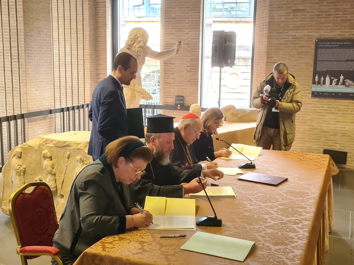 Πραγματοποιήθηκε, σήμερα, στο Βατικανό, η τελετή της υπογραφής του πρωτοκόλλου της δωρεάς των τριών θραυσμάτων από τον γλυπτό διάκοσμο του Παρθενώνα, στην Ελλάδα. Την πράξη δωρεάς υπέγραψαν ο Καρδινάλιος Fernando Vérgez Alzaga Πρόεδρος του Κυβερνείου του Κράτους της Πόλης του Βατικανού, ο εκπρόσωπος του Αρχιεπισκόπου Αθηνών και πάσης Ελλάδος Ιερωνύμου Β΄, πρωτοπρεσβύτερος Εμμανουήλ Παπαμικρούλης, η Υπουργός Πολιτισμού και Αθλητισμού Λίνα Μενδώνη και η Διευθύντρια Μουσείων και Πολιτιστικής Κληρονομιάς του Βατικανού καθ. Barbara Jatta.