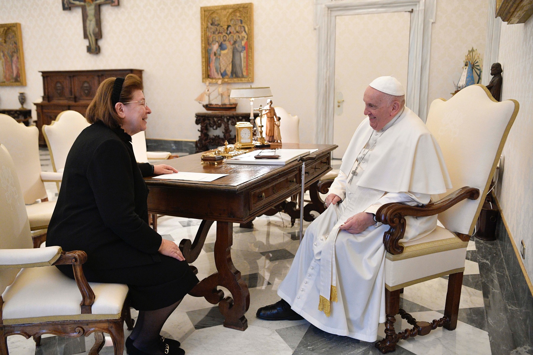 Δεκτή από τον πάπα Φραγκίσκο έγινε σήμερα το πρωί στο Βατικανό η Υπουργός Πολιτισμού και Αθλητισμού Λίνα Μενδώνη. Η συνάντηση, η οποία πραγματοποιήθηκε σε ιδιαίτερα θερμό κλίμα και είχε διάρκεια σαράντα πέντε λεπτά, προγραμματίστηκε έπειτα από πρόσκληση του Ποντίφικα, σε συνέχεια της δωρεάς των τριών θραυσμάτων του Παρθενώνα από τα μουσεία του Βατικανού, τα οποία επανενώθηκαν στο Μουσείο της Ακρόπολης την Παρασκευή 24 Μαρτίου.