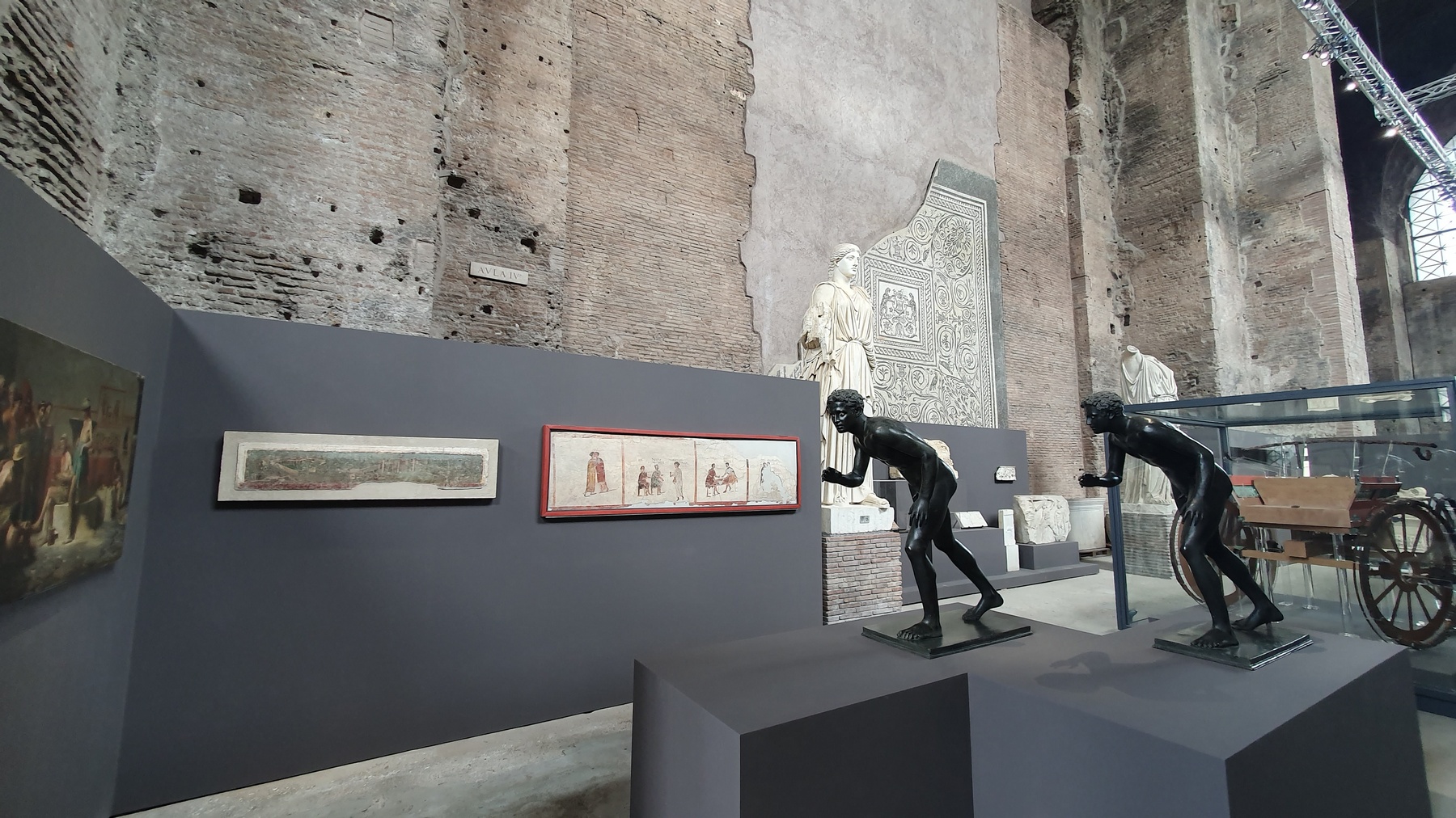 Η πρώτη αίθουσα της έκθεσης ανοίγει με ένα έκθεμα που εκφράζει με τον πιο σαφή τρόπο αυτή τη διπλή σχέση: Το εκμαγείο δύο ανώνυμων θυμάτων της έκρηξης του Βεζούβιου που έδωσε πίσω η αρχαιολογία, ως αιώνια ακινητοποιημένα στη στιγμή του θανάτου. Γύρω τους υπάρχουν διάφορες λαϊκές και καλλιεργημένες μορφές σύγχρονης επανερμηνείας του αρχαίου.
