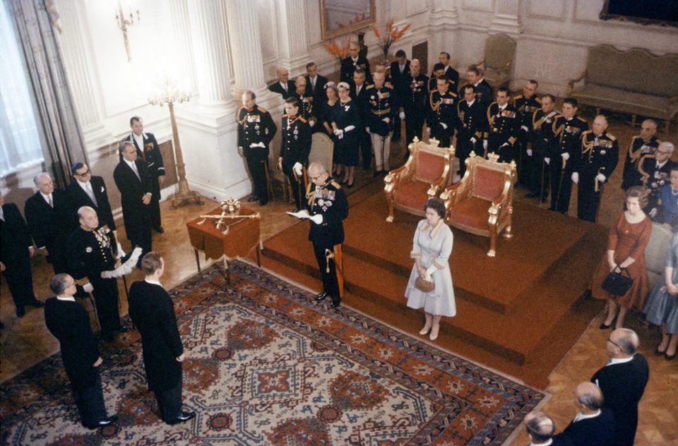 Η τελευταία φορά, που είχαν παρουσιαστεί τα τρία εμβλήματα μαζί ήταν τον Δεκέμβριο 1959, στην τελετή παράδοσής τους από τον Οίκο των Βίτελσμπαχ στον τότε Βασιλιά των Ελλήνων Παύλο. Μετά από διπλωματικές διαπραγματεύσεις, ο αρχηγός του Οίκου των Βίττελσμπαχ, Αλβέρτος, προσέφερε τα εμβλήματα του θρόνου ξανά στην Ελλάδα. Η τελετή της παράδοσής τους έγινε στο Ανάκτορο της Αθήνας (νυν Προεδρικό Μέγαρο), τον Δεκέμβριο του 1959, παρουσία του Πρωθυπουργού Κωνσταντίνου Καραμανλή και μελών του υπουργικού συμβουλίου. Η ημερομηνία επιλέχθηκε για να συμπέσει με την επέτειο της άφιξης του Όθωνα στην Αθήνα, το 1834, και την ανακήρυξη της πόλης ως πρωτεύουσας του νέου ελληνικού βασιλείου. Ο γιος του Αλβέρτου Μαξιμιλιανός-Εμμανουήλ παρέδωσε στο βασιλικό ζεύγος τα πρώτα εμβλήματα του ελληνικού θρόνου, σε μια συμβολική ημέρα για το κράτος και την πρωτεύουσά του.