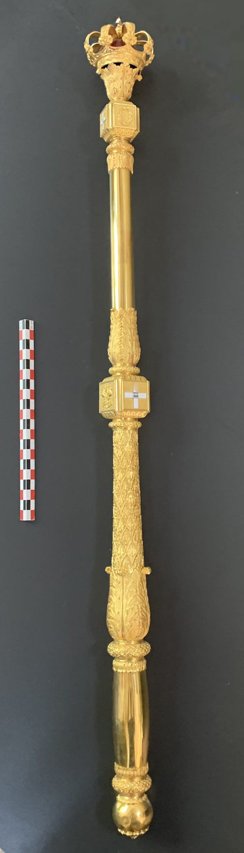 Σκήπτρο αποτελούμενο από τρία επιμήκη στελέχη που ενώνονται με κομβία διακοσμημένα. Στην επίστεψη φέρει στέμμα ολόγλυφο που στο εσωτερικό έχει διακόσμηση με σμάλτο. Στο ανώτερο κυβικό κομβίο σύνδεσης εναλλάσσεται διακόσμηση, με το μονόγραμμα του Όθωνα και σμάλτο με λευκό σταυρό. Στην ένωση των κεραιών διακρίνονται τα χρώματα της βαυαρικής σημαίας. Ακολουθεί στέλεχος, χωρίς διακόσμηση και κομβίο με αντίστοιχη διακόσμηση, όπου αντί για το μονόγραμμα του Όθωνα απεικονίζονται ολόσωμοι αντωποί λέοντες. Το κεντρικό στέλεχος είναι ολόκληρο διακοσμημένο με φυτική διακόσμηση άκανθας. Το κατώτερο στέλεχος απολήγει σε σφαίρα με φυτική διακόσμηση. Σε αυτό το σημείο είναι εγχάρακτη η επιγραφή του κατασκευαστή.