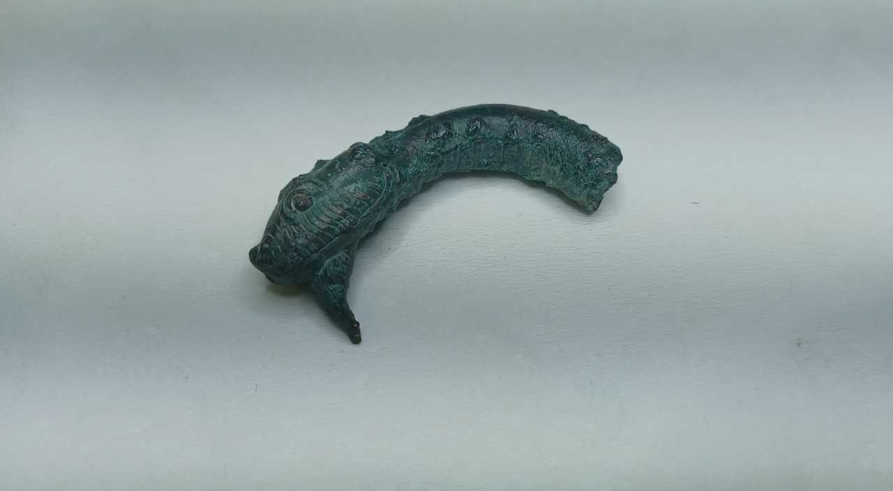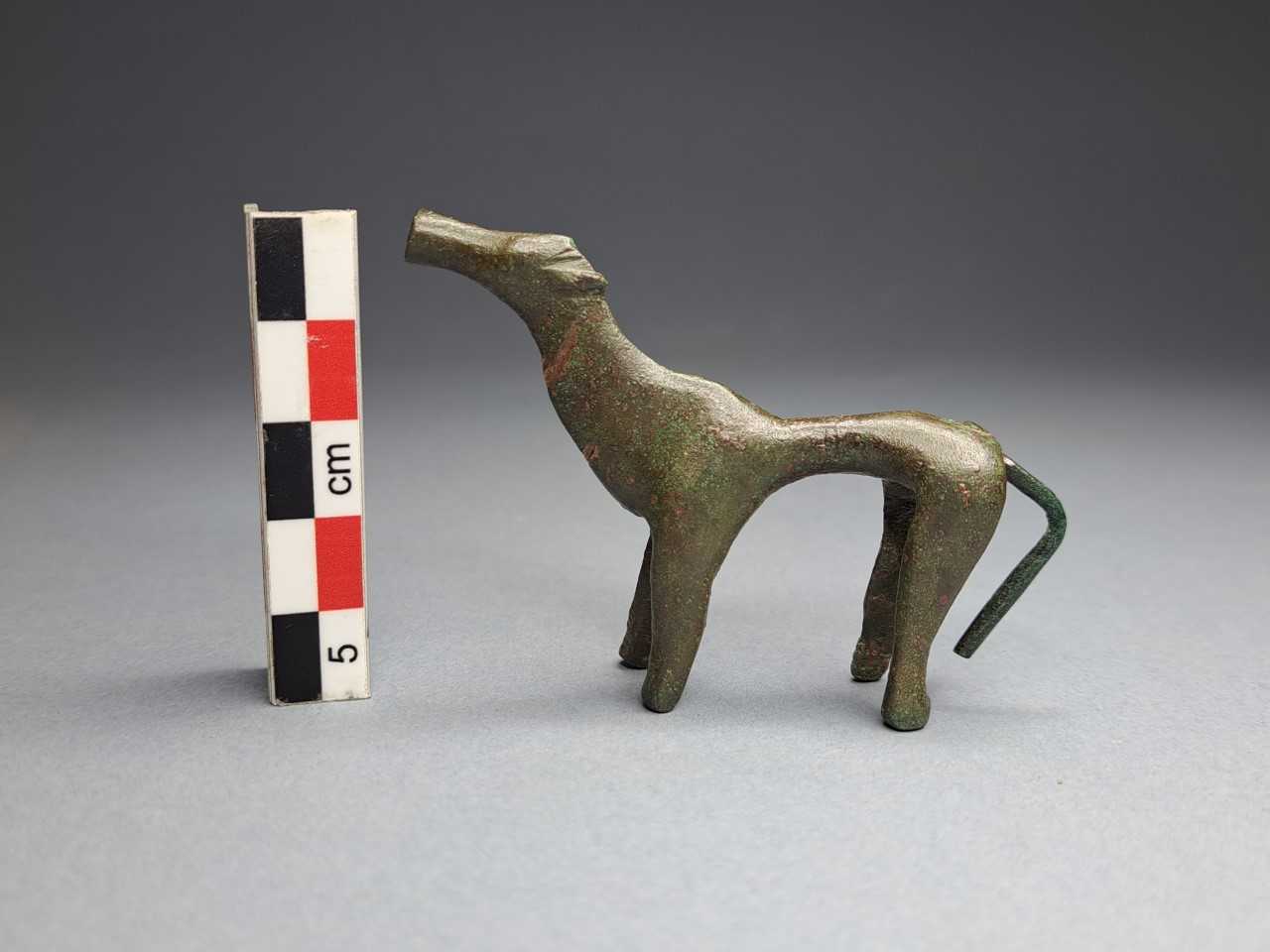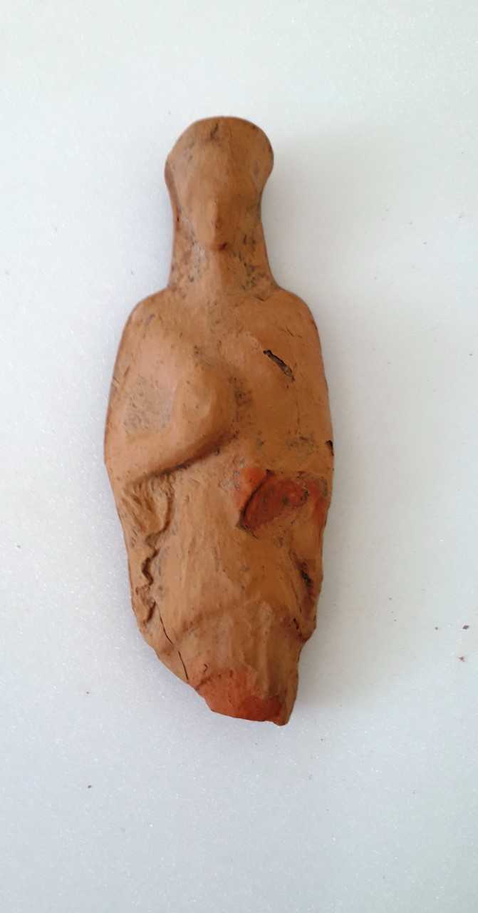 Επίσης, στα ανασκαφικά τετράγωνα ανατολικά των οικοδομημάτων, ήρθε στο φως μεγάλη ποσότητα κεραμικής που χρονολογείται στον 8ο και 9ο αι. π.Χ, πιστοποιώντας την λατρευτική χρήση του χώρου ήδη από το 850 π.Χ. Στα αναθήματα προς την θεότητα που ήταν αφιερωμένος αυτός ο ιερός τόπος συγκαταλέγονται πήλινα και χάλκινα ειδώλια, από τα οποία ξεχωρίζει το χάλκινο ειδώλιο ζώου, πιθανώς σκύλου (ΕΙΚ. 2), πήλινοι τροχοί αμαξών, χάλκινες πόρπες και περόνες (εξαρτήματα στερέωσης των ενδυμάτων), αλλά και σιδερένια όπλα, ενώ ενδιαφέρον είχε η αποκάλυψη μίας χρυσής ψήφου (εξάρτημα περιδεραίου), εύρημα σπάνιο στα ιερά της Αιγιάλειας (ΕΙΚ. 3).