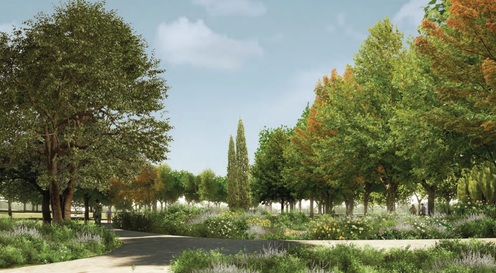 Κύριος στόχος της μελέτης είναι η διαχείριση της μετάβασης μεταξύ δάσους και κήπων, όσο και η αντίληψη του τελευταίου ως περίκλειστου τοπίου, εντείνοντας την αίσθηση της εμβύθισης κατά τη διάρκεια της περιήγησης. Συγχρόνως, η περιμετρική περιοχή μπορεί να δράσει και ως ζώνη επιβράδυνσης πυρκαγιάς, καθώς τα επιλεγμένα δένδρα -πλατύφυλλα και φυλλοβόλα- και ο υποόροφος τους καθυστερούν την επέκταση της φωτιάς. Τα μονοπάτια ακολουθούν τις αρχικές χαράξεις των κήπων, όπως αυτές γίνονται αντιληπτές από τα θραύσματα της οριοθέτησής τους.