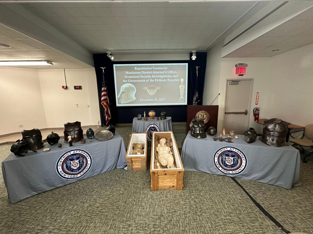 Τριάντα αρχαιότητες επιστρέφουν στην Ελλάδα μετά την κατάσχεσή τους από την Εισαγγελία του Μανχάταν. Οι αρχαιότητες παραδόθηκαν στις ελληνικές Αρχές την Παρασκευή 15 Δεκεμβρίου από τον επικεφαλής της Antiquities Trafficking Unit Matthew Bogdanos Αντιεισαγγελέα στην Εισαγγελία του Μανχάταν, σε ειδική τελετή που πραγματοποιήθηκε στα γραφεία της Εισαγγελίας, παρουσία του Γενικού Γραμματέα Πολιτισμού Γεωργίου Διδασκάλου, του Γενικού Προξένου της Ελλάδας στη Νέα Υόρκη Κωνσταντίνου Κωνσταντίνου και στελεχών της Διεύθυνσης Τεκμηρίωσης και Προστασίας Πολιτιστικών Αγαθών.