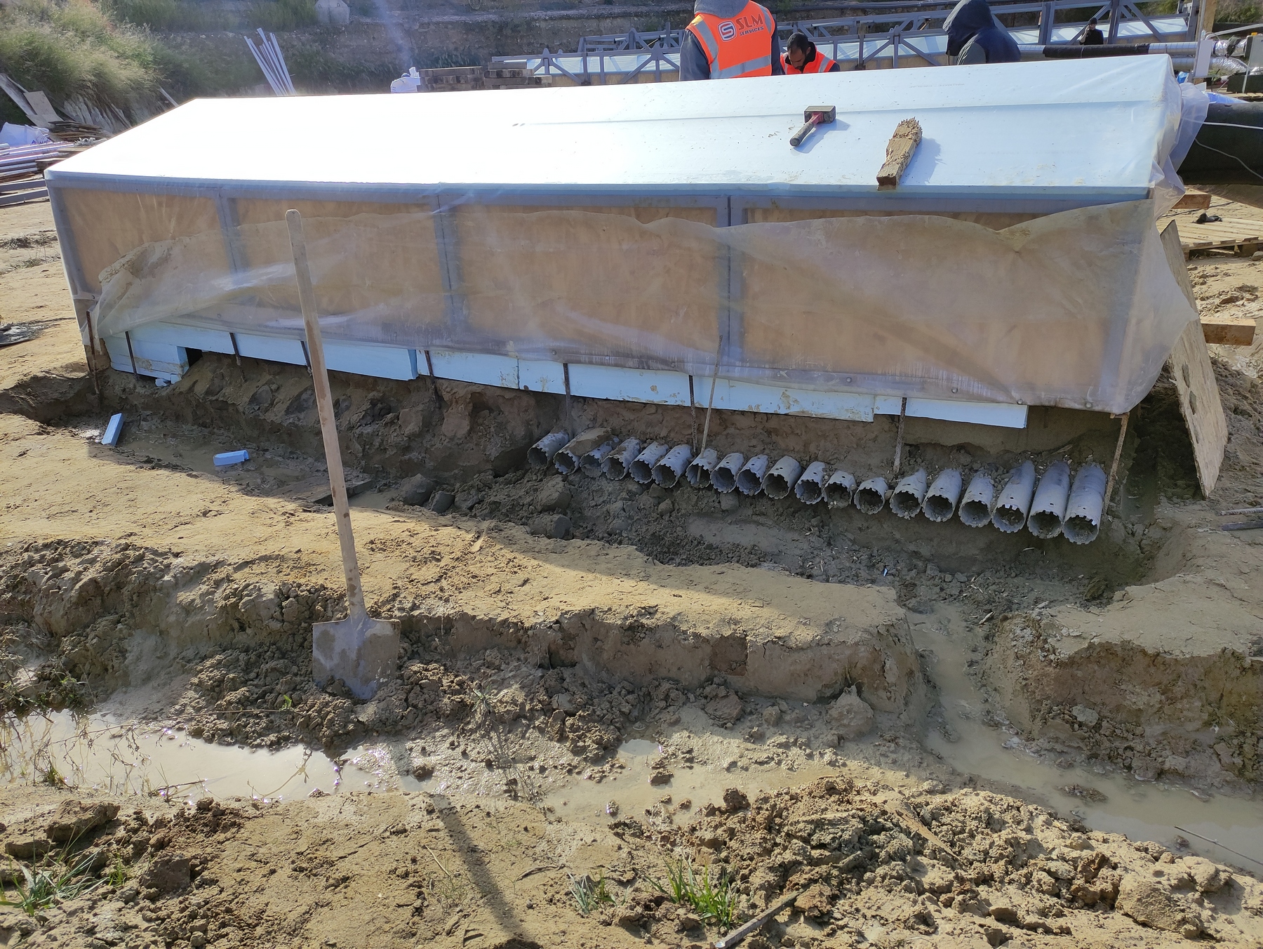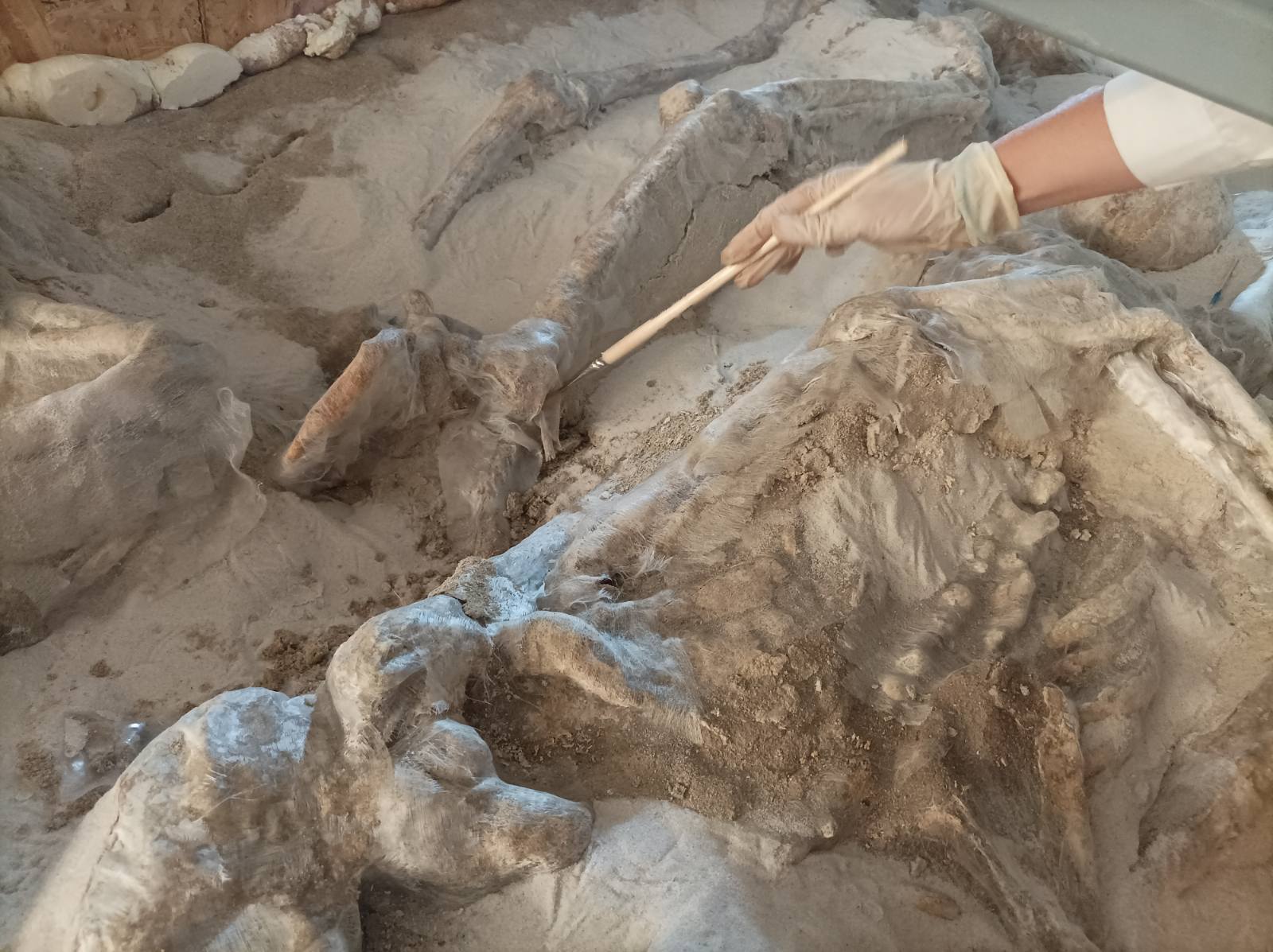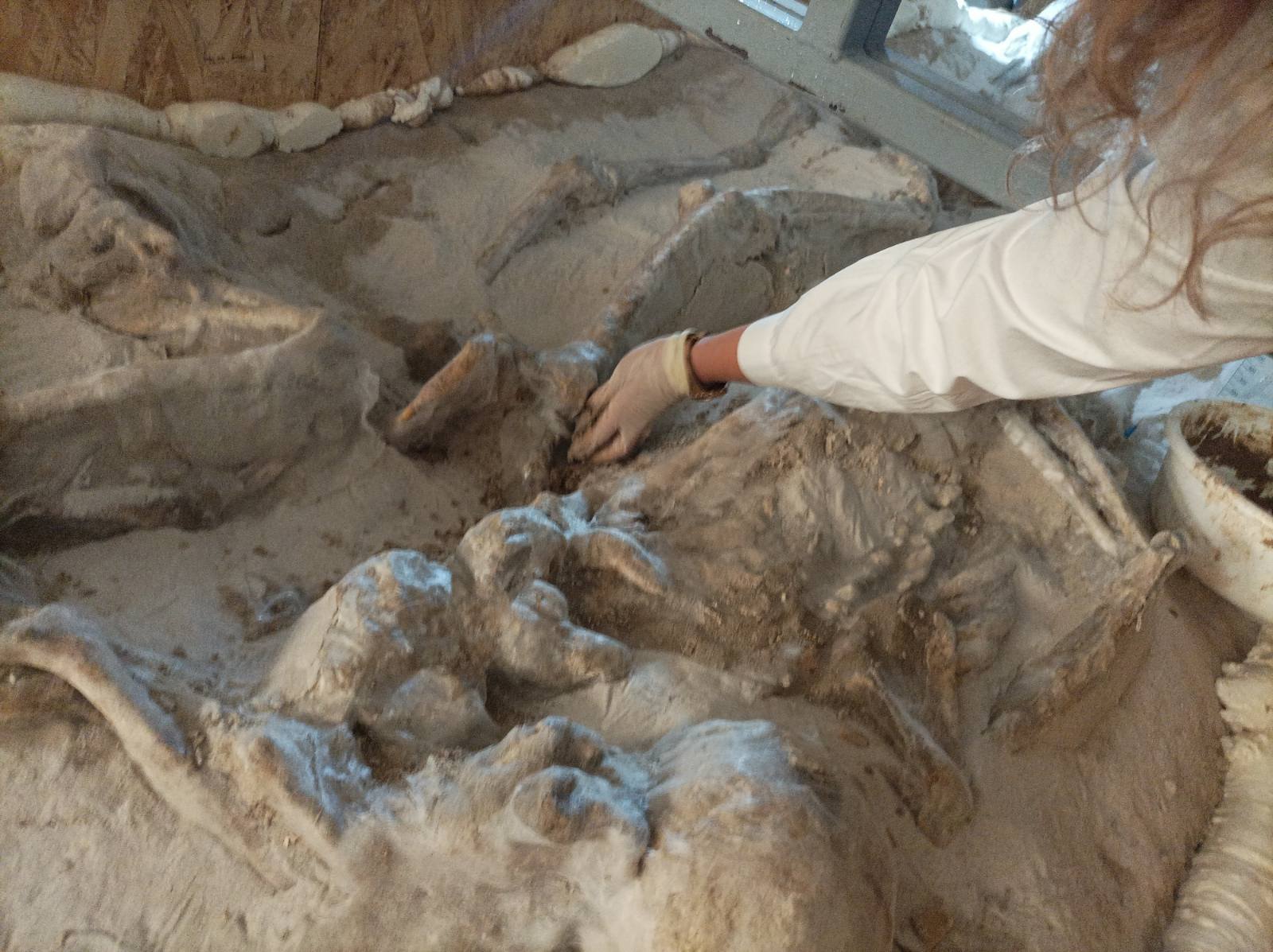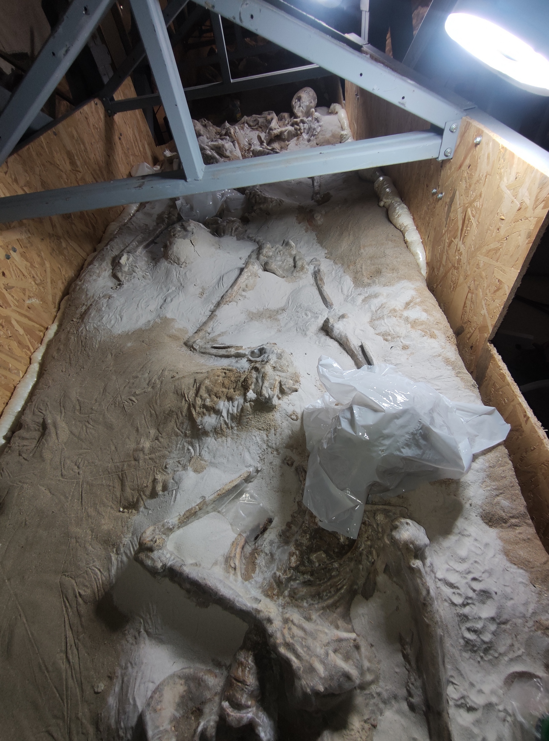 Από την αποκάλυψή του έως το τέλος του 2022, το οστεολογικό υλικό δεχόταν την φροντίδα των συντηρητών της Εφορείας Αρχαιοτήτων κατά χώραν. Όμως, δεδομένων των περιβαλλοντικών συνθηκών, της γειτνίασης με τον υδροφόρο ορίζοντα, τη συνεχή ανερχόμενη υγρασία, σε συνδυασμό με την ύπαρξη αλάτων και την διαρκή ανακρυστάλλωσή τους, αποφασίστηκε –μετά την ομόφωνα θετική γνωμοδότησή του Κεντρικού Αρχαιολογικού Συμβουλίου- η προσωρινή μετακίνησή του από το χώρο εύρεσής του σε κατάλληλα διαμορφωμένη παρακείμενη θέση, επάνω σε υπόβαση σκυροδέματος. Οι εργασίες μετακίνησης έγιναν, στις αρχές του 2023, με ολίσθηση επάνω σε σιδερένιες ράγες για τις δυο πρώτες συστάδες και από γερανοφόρο όχημα για την τρίτη συστάδα, αφού πρώτα το οστεολογικό υλικό εγκιβωτίστηκε σε ξύλινες κατασκευές και το σύνολο του ευρήματος συγκρατήθηκε με την κατασκευή μεταλλικού χωροδικτυώματος. Για τον έλεγχο των περιβαλλοντικών συνθηκών εγκαταστάθηκε εντός του προσωρινού κελύφους μηχανολογικός εξοπλισμός ύγρανσης-αφύγρανσης και κλιματισμού ενώ οι συνθήκες καταγράφονται διαρκώς μέσω ηλεκτρονικών καταγραφέων.