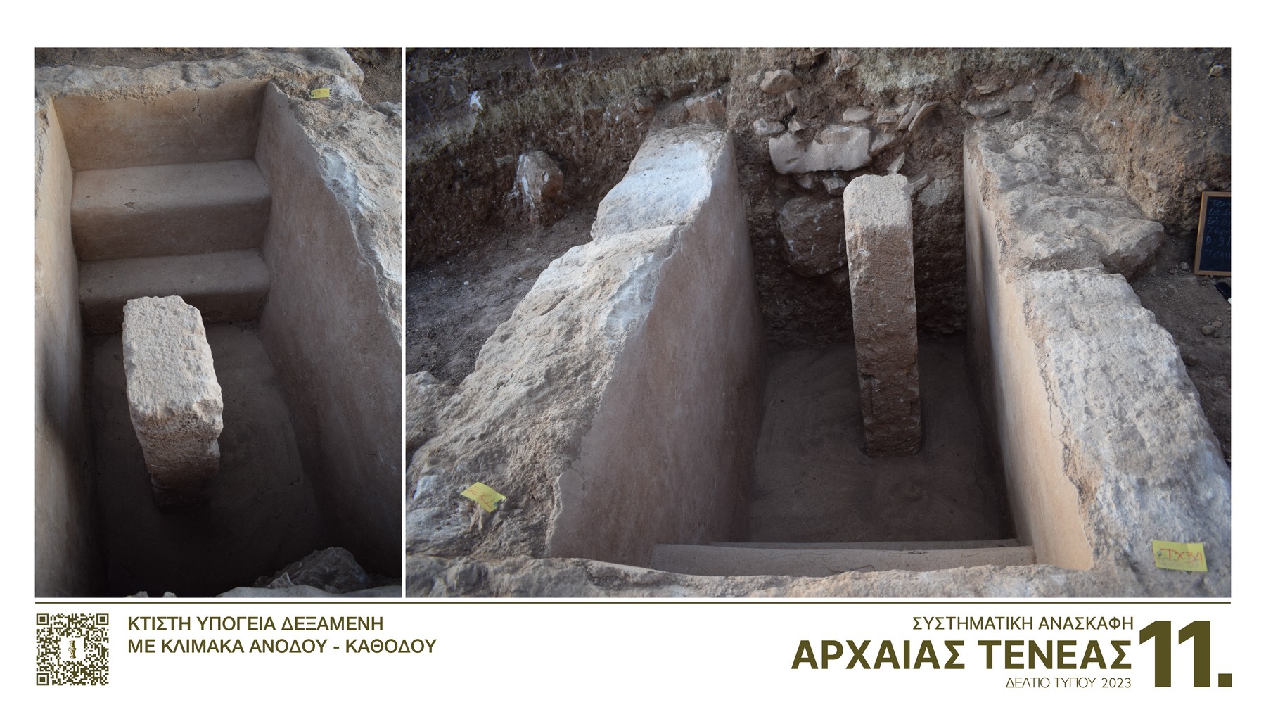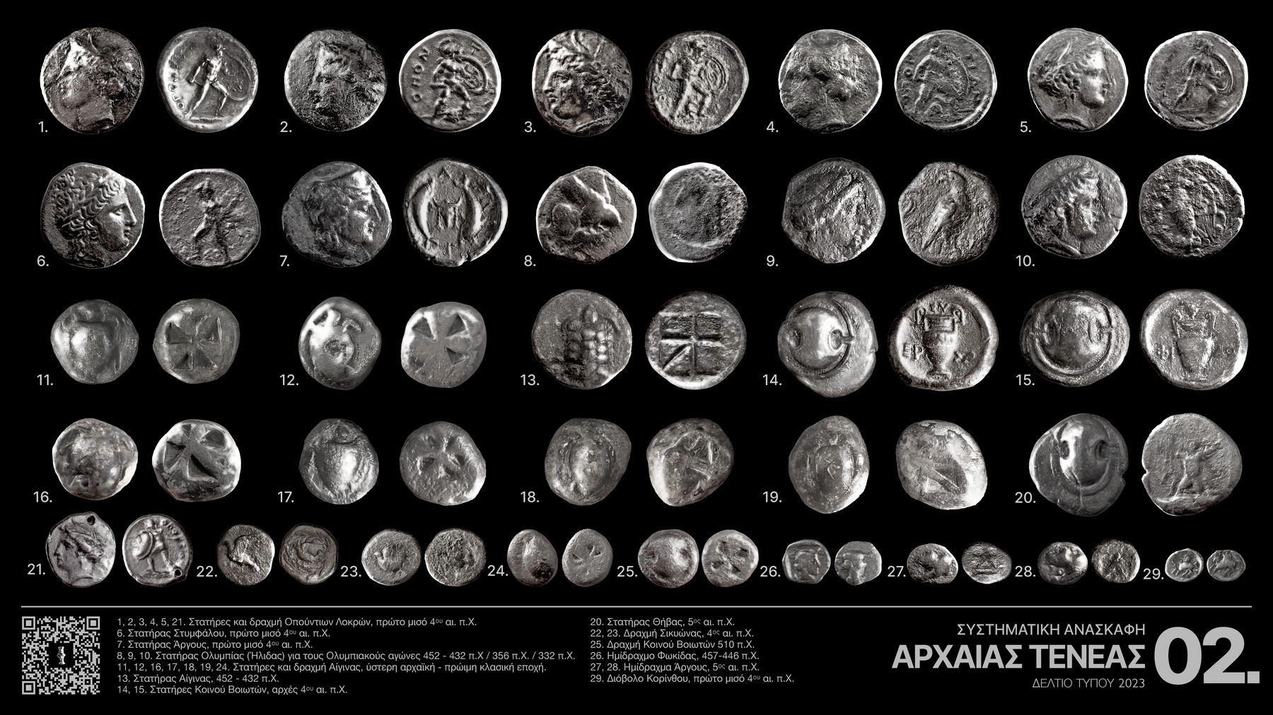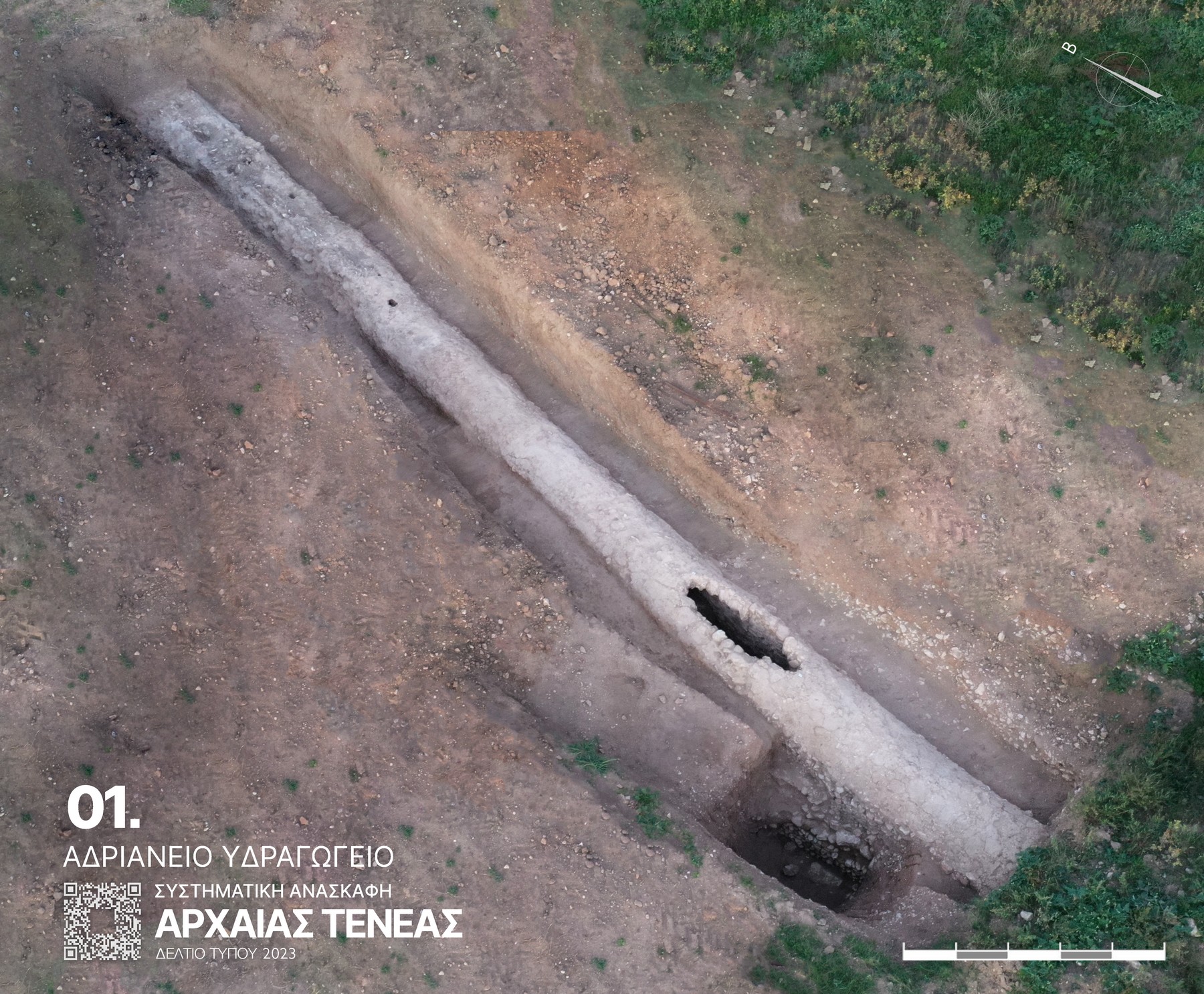 Η ανασκαφή, μεταξύ άλλων, αποκάλυψε για πρώτη φορά φέτος, τμήμα του Αδριάνειου υδραγωγείου στην περιοχή της αρχαίας Τενέας, προσδιορίζοντας επακριβώς πλέον την πορεία ενός από τα μεγαλύτερα υδραυλικά έργα του 2ου αι. μ.Χ. στον ελλαδικό χώρο, που σκοπό είχε την υδροδότηση της Αρχαίας Κορίνθου από τη Στυμφαλία (εικ. 1). Ταυτόχρονα, εντοπίστηκε και ανασκάφηκε τμήμα του προϊστορικού οικισμού της Τενέας, που χρονολογείται στην Πρώιμη εποχή του Χαλκού ΙΙ (2.600 – 2300 π.Χ), επιβεβαιώνοντας την κατοίκηση της περιοχής πριν τη πτώση της Τροίας. Επιπρόσθετα, αποκαλύφθηκε πλούσιο κτιριακό συγκρότημα των ύστερων αρχαϊκών χρόνων μέχρι τους ελληνιστικούς χρόνους, με επιμέρους χώρους λατρευτικής χρήσης μεταξύ αυτών και τριών εξαιρετικά επιμελημένων δεξαμενών, η μια εξ αυτών με κλίμακα καθόδου - ανόδου. Εξαιρετικής αρχαιολογικής σημασίας και σπανιότητας είναι ο θησαυρός 29 αργυρών αρχαίων ελληνικών νομισμάτων (εικ. 2) που εντοπίστηκε μαζί με φορητό πήλινο βωμό, μικρογραφικό αγγείο και ειδώλιο ίππου με αναβάτη. Ο θησαυρός περιλαμβάνει νομίσματα που χρονολογούνται από τον ύστερο 6ο αι. π.Χ. μέχρι και τη δεκαετία του 330 π.Χ., πολλά εξ αυτών από τα σπανιότερα και πλέον ιστορικά νομίσματα της αρχαίας Ελλάδας, όπως τρεις στατήρες Ήλιδος που κόπηκαν στην Ολυμπία κατά τη διάρκεια διαφορετικών Ολυμπιακών Αγώνων, στατήρα της Αίγινας με χερσαία αντί για θαλάσσια χελώνα, στατήρες Στύμφαλου, Άργους και Οπουντίων Λοκρών, καθώς στατήρα Θήβας του 5ου αι. π. Χ. που απεικονίζει τον Ηρακλή να πνίγει με τα χέρια του δύο φίδια. Η παρουσία του εν λόγω θησαυρού συνδέεται με τα ευρήματα λατρευτικής χρήσης (γυναικεία και ζωόμορφα ειδώλια, μικρογραφικά αγγεία και άλλα) που είχαν εντοπιστεί πέρυσι και συνέχισαν να εντοπίζονται και φέτος προσδίδοντας ξεκάθαρα τελετουργικό χαρακτήρα στους χώρους που αποκαλύπτονται. Σε ανώτερα ανασκαφικά στρώματα ανασκάφηκαν δύο κτιριακά συγκροτήματα των ρωμαϊκών και ύστερων ρωμαϊκών χρόνων. Το ένα έκτασης 160 τ.μ. που αποτελεί συνέχεια αυτού των 281 τ.μ. του 2022, με επιμέρους εργαστηριακές εγκαταστάσεις και χώρους αποθήκευσης. Το δεύτερο κτηριακό συγκρότημα ανεσκαμμένης έκτασης 300 τ.μ. με επιμέρους δωμάτια περιμετρικά ενός υπερυψωμένου στεγασμένου προστώου - διαδρόμου μήκους μέχρις στιγμής 14,5 μ. και πλάτους 3 μ., που φέρει επίστρωση από πήλινες πλάκες. Τέλος, ανασκάφηκαν στη ζώνη των νεκροταφείων και δίπλα στο ρωμαϊκό ταφικό μνημείου ΙΙ του 2022 λακκοειδείς τάφοι ρωμαϊκών χρόνων (εικ. 3) και συστάδα αρχαϊκών τάφων πλούσια κτερισμένων (εικ. 4, 5, 6).
