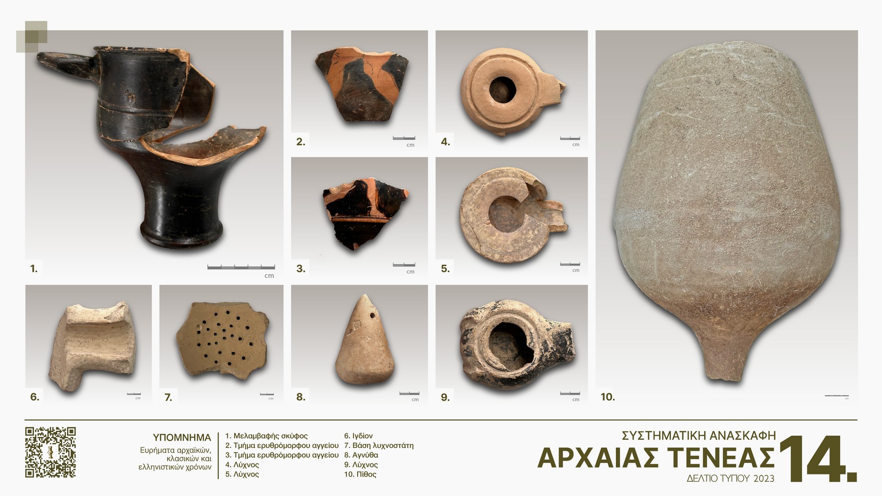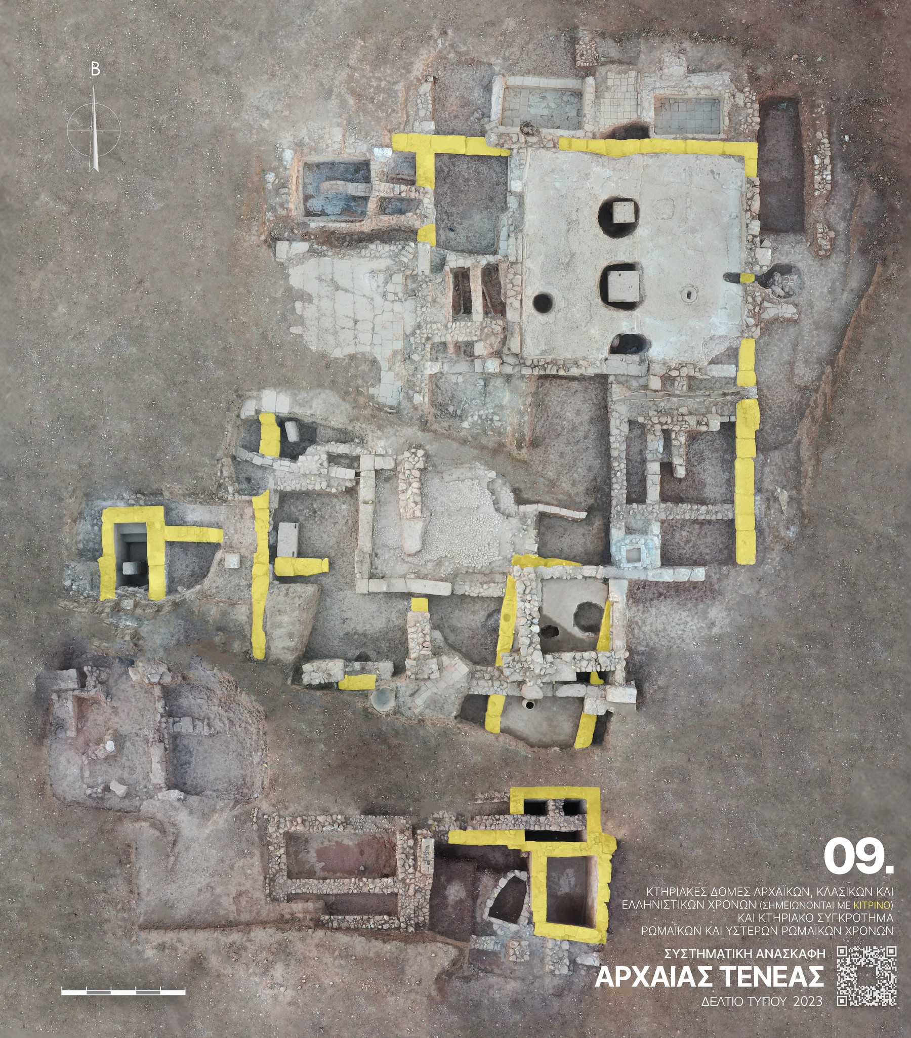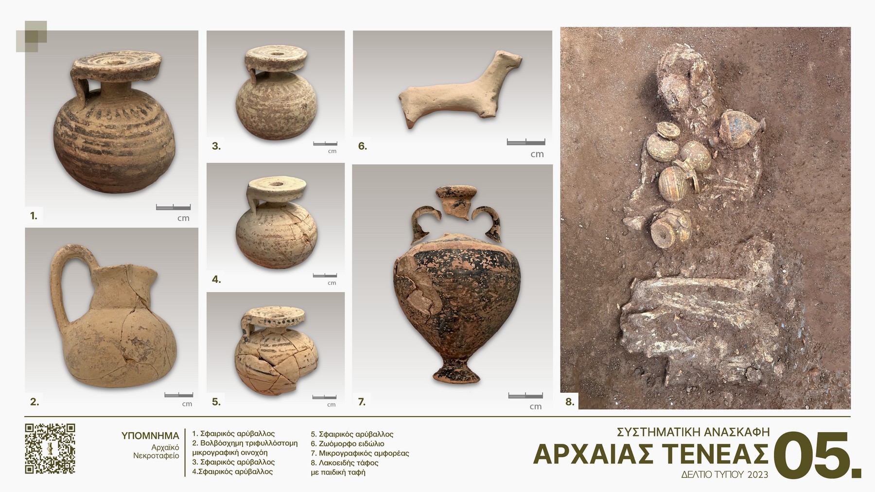 Η ανασκαφή, μεταξύ άλλων, αποκάλυψε για πρώτη φορά φέτος, τμήμα του Αδριάνειου υδραγωγείου στην περιοχή της αρχαίας Τενέας, προσδιορίζοντας επακριβώς πλέον την πορεία ενός από τα μεγαλύτερα υδραυλικά έργα του 2ου αι. μ.Χ. στον ελλαδικό χώρο, που σκοπό είχε την υδροδότηση της Αρχαίας Κορίνθου από τη Στυμφαλία (εικ. 1). Ταυτόχρονα, εντοπίστηκε και ανασκάφηκε τμήμα του προϊστορικού οικισμού της Τενέας, που χρονολογείται στην Πρώιμη εποχή του Χαλκού ΙΙ (2.600 – 2300 π.Χ), επιβεβαιώνοντας την κατοίκηση της περιοχής πριν τη πτώση της Τροίας. Επιπρόσθετα, αποκαλύφθηκε πλούσιο κτιριακό συγκρότημα των ύστερων αρχαϊκών χρόνων μέχρι τους ελληνιστικούς χρόνους, με επιμέρους χώρους λατρευτικής χρήσης μεταξύ αυτών και τριών εξαιρετικά επιμελημένων δεξαμενών, η μια εξ αυτών με κλίμακα καθόδου - ανόδου. Εξαιρετικής αρχαιολογικής σημασίας και σπανιότητας είναι ο θησαυρός 29 αργυρών αρχαίων ελληνικών νομισμάτων (εικ. 2) που εντοπίστηκε μαζί με φορητό πήλινο βωμό, μικρογραφικό αγγείο και ειδώλιο ίππου με αναβάτη. Ο θησαυρός περιλαμβάνει νομίσματα που χρονολογούνται από τον ύστερο 6ο αι. π.Χ. μέχρι και τη δεκαετία του 330 π.Χ., πολλά εξ αυτών από τα σπανιότερα και πλέον ιστορικά νομίσματα της αρχαίας Ελλάδας, όπως τρεις στατήρες Ήλιδος που κόπηκαν στην Ολυμπία κατά τη διάρκεια διαφορετικών Ολυμπιακών Αγώνων, στατήρα της Αίγινας με χερσαία αντί για θαλάσσια χελώνα, στατήρες Στύμφαλου, Άργους και Οπουντίων Λοκρών, καθώς στατήρα Θήβας του 5ου αι. π. Χ. που απεικονίζει τον Ηρακλή να πνίγει με τα χέρια του δύο φίδια. Η παρουσία του εν λόγω θησαυρού συνδέεται με τα ευρήματα λατρευτικής χρήσης (γυναικεία και ζωόμορφα ειδώλια, μικρογραφικά αγγεία και άλλα) που είχαν εντοπιστεί πέρυσι και συνέχισαν να εντοπίζονται και φέτος προσδίδοντας ξεκάθαρα τελετουργικό χαρακτήρα στους χώρους που αποκαλύπτονται. Σε ανώτερα ανασκαφικά στρώματα ανασκάφηκαν δύο κτιριακά συγκροτήματα των ρωμαϊκών και ύστερων ρωμαϊκών χρόνων. Το ένα έκτασης 160 τ.μ. που αποτελεί συνέχεια αυτού των 281 τ.μ. του 2022, με επιμέρους εργαστηριακές εγκαταστάσεις και χώρους αποθήκευσης. Το δεύτερο κτηριακό συγκρότημα ανεσκαμμένης έκτασης 300 τ.μ. με επιμέρους δωμάτια περιμετρικά ενός υπερυψωμένου στεγασμένου προστώου - διαδρόμου μήκους μέχρις στιγμής 14,5 μ. και πλάτους 3 μ., που φέρει επίστρωση από πήλινες πλάκες. Τέλος, ανασκάφηκαν στη ζώνη των νεκροταφείων και δίπλα στο ρωμαϊκό ταφικό μνημείου ΙΙ του 2022 λακκοειδείς τάφοι ρωμαϊκών χρόνων (εικ. 3) και συστάδα αρχαϊκών τάφων πλούσια κτερισμένων (εικ. 4, 5, 6).