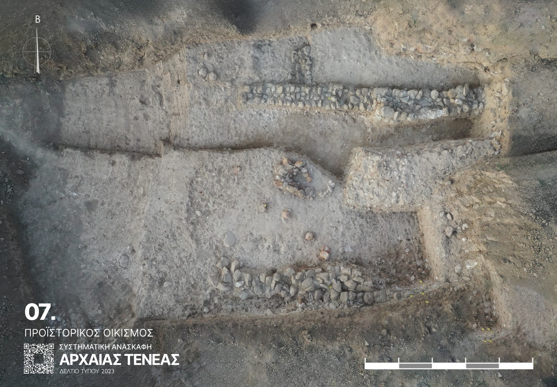 Στις παρυφές του λόφου «Άγιοι Ασώματοι» ανατολικά του υδραγωγείου αποκαλύφθηκαν τα πρώτα κατάλοιπα του προϊστορικού οικισμού της Τενέας. Συγκεκριμένα ανασκάφηκαν οδικές αρτηρίες που ανήκαν σε ένα ευρύτερο πολεοδομικό πρότυπο όπου οι οικίες διαμορφώνονταν εκατέρωθεν (εικ. 7). Αποκαλύφθηκαν τα τμήματα δύο τοίχων στον άξονα Α/Δ διαστάσεων έκαστος 6, 50 μ. μήκος και 0,55 μ. πλάτος και 5,30 μ. μήκος και 0,50 μ. πλάτος, κατασκευασμένοι από αργούς λίθους μεσαίου μεγέθους με συνδετικό υλικό χώμα. Χαρακτηριστική είναι η μεγάλη συγκέντρωση οπτοπλίνθων τετράγωνης κυρίως διατομής με διαμορφωμένα μέτωπα στις 4 πλευρές τους που πιθανότατα αποτελούν την ανωδομή των τοίχων. Επιπλέον ανασκάφηκε θερμική κατασκευή ελλειψοειδούς σχήματος μήκους 1,50 μ. και πλάτους 0,90 μ. Περισυλλέχθηκε σημαντική ποσότητα εργαλείων από οψιανό, χειροποίητης κεραμικής από χονδροειδή και λεπτόκοκκα αγγεία με καλά λειασμένες και στιλβωμένες επιφάνειες και ποικίλα επιχρίσματα. Μεταξύ άλλων εντοπίζονται πίθοι, πρόχοι, φιάλες, σαλτσιέρες, λεκανίδες, τριποδικά αγγεία, κρατευτές και πήλινες εστίες. Επίσης, βρέθηκαν τμήματα από αρύταινες και κουτάλια, σφονδύλια, ζωόμορφα ειδώλια κριαριών και μια οστέινη κτένα (εικ. 8). Αξίζει να επισημανθεί η έντονη παρουσία εισηγμένης κεραμικής από την Αίγινα, την Αττική, την Αργολίδα και την Κόρινθο, δηλωτικό των επαφών που είχε αναπτύξει ο εν λόγω οικισμός με αυτές τις περιοχές. Τα ευρήματα του οικισμού είναι χρονολογικά σύγχρονα με αυτά του κτιστού αποθέτη που ανασκάφηκε το 2021, τα οποία ωστόσο ήταν αντικείμενα τελετουργικών αποθέσεων. Σε κάθε περίπτωση ο αποθέτης φαίνεται πως είναι μέρος του ευρύτερου οικοδομικού ιστού του συγκεκριμένου οικισμού, ο οποίος απλώνεται σε μεγάλη έκταση.