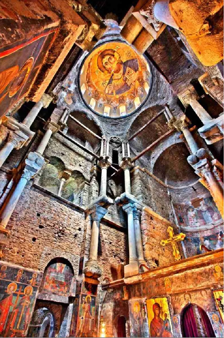 Η είσοδος στον Ναό γίνεται από τη δυτική πλευρά, όπου μια ημικυκλική σκάλα οδηγεί στον νάρθηκα. Ο γλυπτός διάκοσμος του μνημείου παρουσιάζει πολυμορφία και πρωτοτυπία, κυρίως, λόγω των τόξων των καμαρών που στηρίζουν τον τρούλο. Ο Ναός είχε αρχικά μαρμάρινο τέμπλο, που καταστράφηκε κατά τη διάρκεια της τουρκοκρατίας. Ο Ναός έφερε, επίσης, ψηφιδωτά που διακοσμούσαν τον τρούλο. Τα ψηφιδωτά χρονολογούνται στα τέλη του 13ου αιώνα. Στο ιερό και στους τοίχους του ισογείου του κυρίως Ναού υπάρχουν τοιχογραφίες, οι οποίες έγιναν σε διαφορετικές εποχές, μετά την καταστροφή της ορθομαρμάρωσης που διακοσμούσε αρχικά τον Ναό. Οι τοίχοι του κυρίως Ναού είναι σήμερα αγιογραφημένοι με τοιχογραφίες που έγιναν σε δύο επάλληλα στρώματα. Από τις τοιχογραφίες του πρώτου στρώματος, που πιθανώς έγιναν την ίδια εποχή με αυτές του ιερού, διακρίνονται ελάχιστα ίχνη. Καλύτερα σώζονται οι τοιχογραφίες του δεύτερου και νεότερου στρώματος που διακοσμούν τους τοίχους του ισογείου. Οι τοιχογραφίες του κυρίως Ναού δεν είναι χρονολογημένες. Οι τοιχογραφίες του δεύτερου στρώματος χρονολογούνται στο β' μισό του 17ου αιώνα. Στο τέμπλο, οι τοιχογραφίες του παλαιότερου στρώματος πρέπει να είναι σύγχρονες με την εικονογράφηση του ιερού τον 16ο αιώνα. Στο δεύτερο στρώμα ανήκουν οι τοιχογραφίες των ολόσωμων αγίων που παρουσιάζουν αρκετές ομοιότητες με τις τοιχογραφίες του κυρίως Ναού.