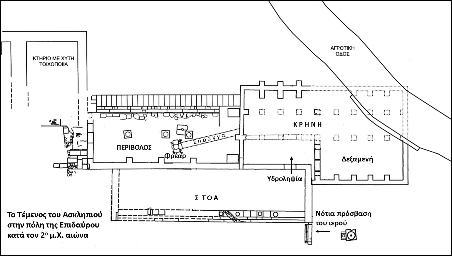 Το ιερό αποτελείται από έναν υπαίθριο περίβολο 100 τμ., μία κρήνη με δεξαμενή 220 τμ. και μία στοά μπροστά τους, 128 τμ. (εικ.5). Όπως μαρτυρεί ο Παυσανίας στον υπαίθριο περίβολο ήταν στημένα τα αγάλματα του Ασκληπιού και της Ηπιόνης. Στην απέναντι ανατολική πλευρά, ο τοίχος του περιβόλου ήταν κλιμακωτός και στις βαθμίδες του σώζονται τα λαξεύματα για την στερέωση στηλών ή άλλων αναθημάτων. Στο κέντρο του περιβόλου διατηρήθηκε φρέαρ, με καλοχτισμένο τοίχωμα, από το οποίο μία υπόγεια κτιστή οξυκόρυφη σήραγγα οδηγούσε το νερό του στην κρήνη (εικ.6) η οποία βρίσκεται σε επαφή με τον περίβολο. Το νερό αποτελούσε κύριο συστατικό στοιχείο στα Ασκληπιεία. Γι' αυτό και το οικοδόμημα της κρήνης έλαβε μνημειώδη μορφή και διαστάσεις. Ο χώρος υδροληψίας, στην πρώτη φάση της λειτουργίας του ιερού, είχε πρόσοψη ιωνικού ρυθμού με τρεις κίονες ανάμεσα σε πεσσούς και στο εσωτερικό του αρυκρήνη και λεκάνες με ροοκρήνες (εικ.7).