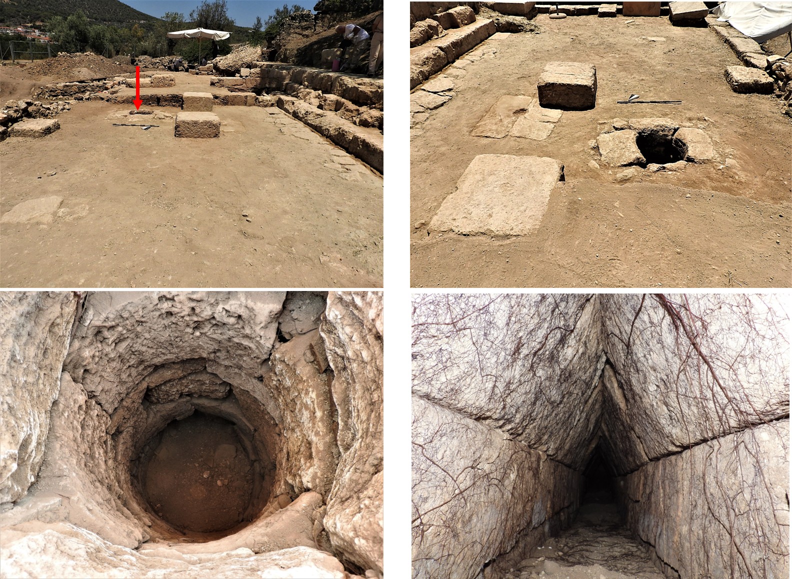 - Πάνω ο Περίβολος του Τεμένους από τα νότια και τα βόρεια. Κάτω το φρέαρ και η σήραγγα επικοινωνίας του με τη δεξαμενή της Κρήνης
