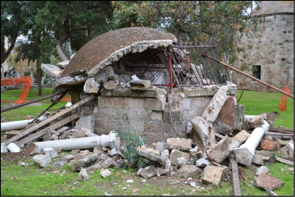 Το μαυσωλείο Μεχμέτ Σεκίμπ Πασά κατέρρευσε, το 2013, από έντονα καιρικά φαινόμενα, όμως τα αίτια της κατάρρευσης εντοπίζονται στην κατασκευή του μνημείου και στην κακή κατάσταση στην οποία είχε περιέλθει λόγω γήρανσης και αστοχίας των υλικών. Σύμφωνα με την επιγραφή στον τάφο, ο Μεχμέτ Σεκίμπ απεβίωσε το 1894. Ωστόσο, το μαυσωλείο με τη σημερινή του μορφή κατασκευάστηκε μετά το 1927 επί ιταλοκρατίας, την περίοδο διοίκησης του Mario Lago. Στόχος των εργασιών είναι η αποκατάσταση της μορφής του ταφικού μνημείου, όπως αποδόθηκε επί ιταλοκρατίας με προσπάθεια ένταξης και επανάχρησης όσων αρχιτεκτονικών μελών επιτρέψει η κατάσταση διατήρησής τους, μετά την συντήρηση και επισκευή τους.