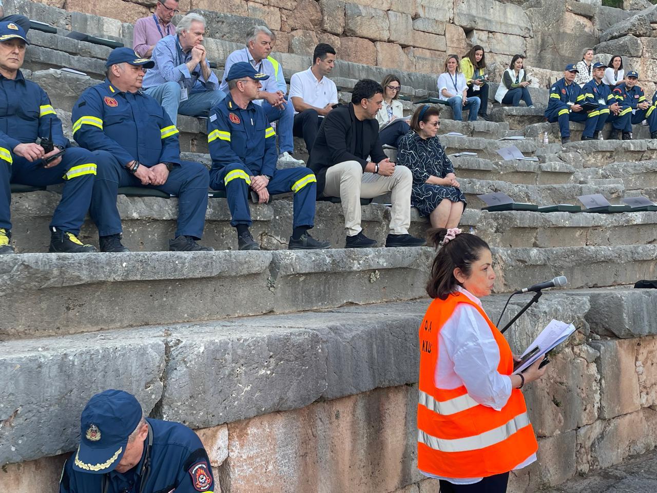 Άσκηση ετοιμότητας οργανωμένης προληπτικής απομάκρυνσης επισκεπτών λόγω δασικής πυρκαγιάς, πραγματοποιήθηκε στον Αρχαιολογικό Χώρο των Δελφών παρουσία της Υπουργού Πολιτισμού Λίνας Μενδώνη και του Υπουργού Κλιματικής Κρίσης και Πολιτικής Προστασίας Βασίλη Κικίλια.