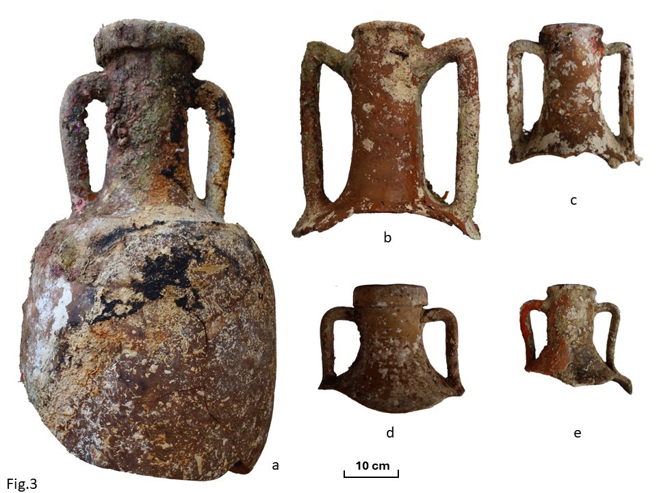 Σε ό,τι αφορά τα κεραμικά ευρήματα, εκτός από τα θραύσματα που εντοπίστηκαν στη διάρκεια της ανασκαφής τα οποία και ανελκύστηκαν, έμφαση δόθηκε στην λεπτομερή αναγνώριση της τυπολογίας των εμπορικών αμφορέων. Ήδη από προηγούμενες ανασκαφές στο ναυάγιο έχουν καταγραφεί πέντε διαφορετικοί τύποι: Κώοι, Ροδιακοί, Ψευδοκώοι, ημιαμφορείς, Εφεσιανοί/Ομάδα Νίκανδρου και Lamboglia 2.
