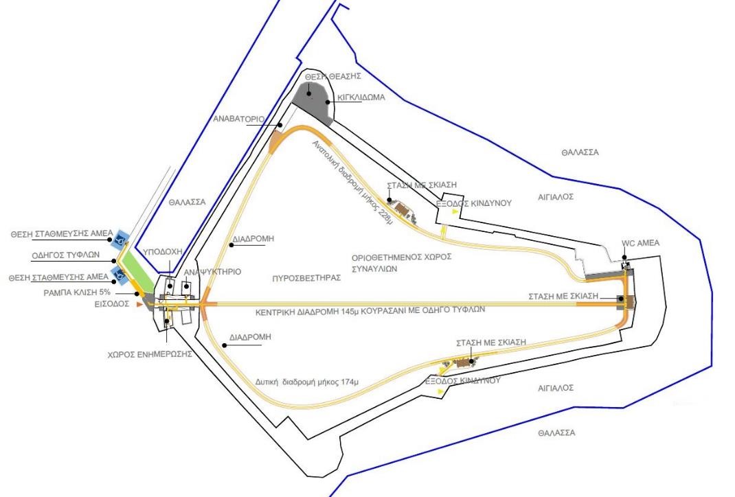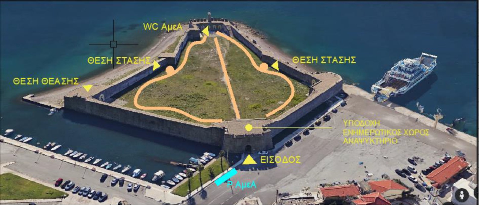 Για την περιήγηση των εμποδιζόμενων επισκεπτών επιλέχθηκε κυκλική διαδρομή, κατάλληλη από πλευράς ενδιαφέροντος και δυνατοτήτων επέμβασης. Προβλέπεται η δημιουργία θέσεων στάθμευσης για εμποδιζόμενα άτομα πλησίον της εισόδου και η διαμόρφωση προσβάσιμου στα εμποδιζόμενα άτομα πεζοδρομίου. Διατηρούνται η είσοδος και η καμαροσκέπαστη στοά που είναι συνεπίπεδες με τον δρόμο και ενισχύεται ο φωτισμός. Δημιουργούνται χώροι εξυπηρέτησης του κοινού, προσβάσιμοι σε όλους, όπως αναψυκτήριο, αίθουσα ψηφιακής ενημέρωσης, ενώ διατηρείται το υφιστάμενο φυλάκιο-εκδοτήριο. Διαμορφώνονται ράμπες και οδηγός τυφλών, ενώ τροποποιούνται οι χώροι υγιεινής. Κατασκευάζονται προσβάσιμες διαδρομές -κυκλική και κεντρική- στον υπαίθριο χώρο, στις οποίες περιλαμβάνεται και οδηγός τυφλών. Διαμορφώνονται τρεις θέσεις στάσης κατά την πορεία των διαδρομών, μία στην ανατολική, μία στη δυτική πλευρά και μία κάτω από το νότιο προμαχώνα, με σκίαστρα και σημειακή φύτευση. Τοποθετείται ειδική σήμανση για ΑμεΑ με απτικές πινακίδες σε γραφή Braille. Δημιουργείται πρόσβαση στο βορειοανατολικό προμαχώνα για πανοραμική θέαση μέσω της κατασκευής αναβατορίου με πλατφόρμα για αμαξίδια, ενώ η υφιστάμενη ράμπα αναδιαμορφώνεται για τους λοιπούς επισκέπτες. Δημιουργείται κατάλληλο για εμποδιζόμενα άτομα ψηφιακό υλικό ενημέρωσης.