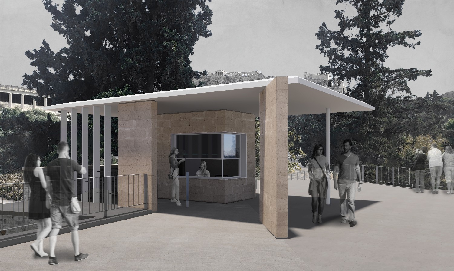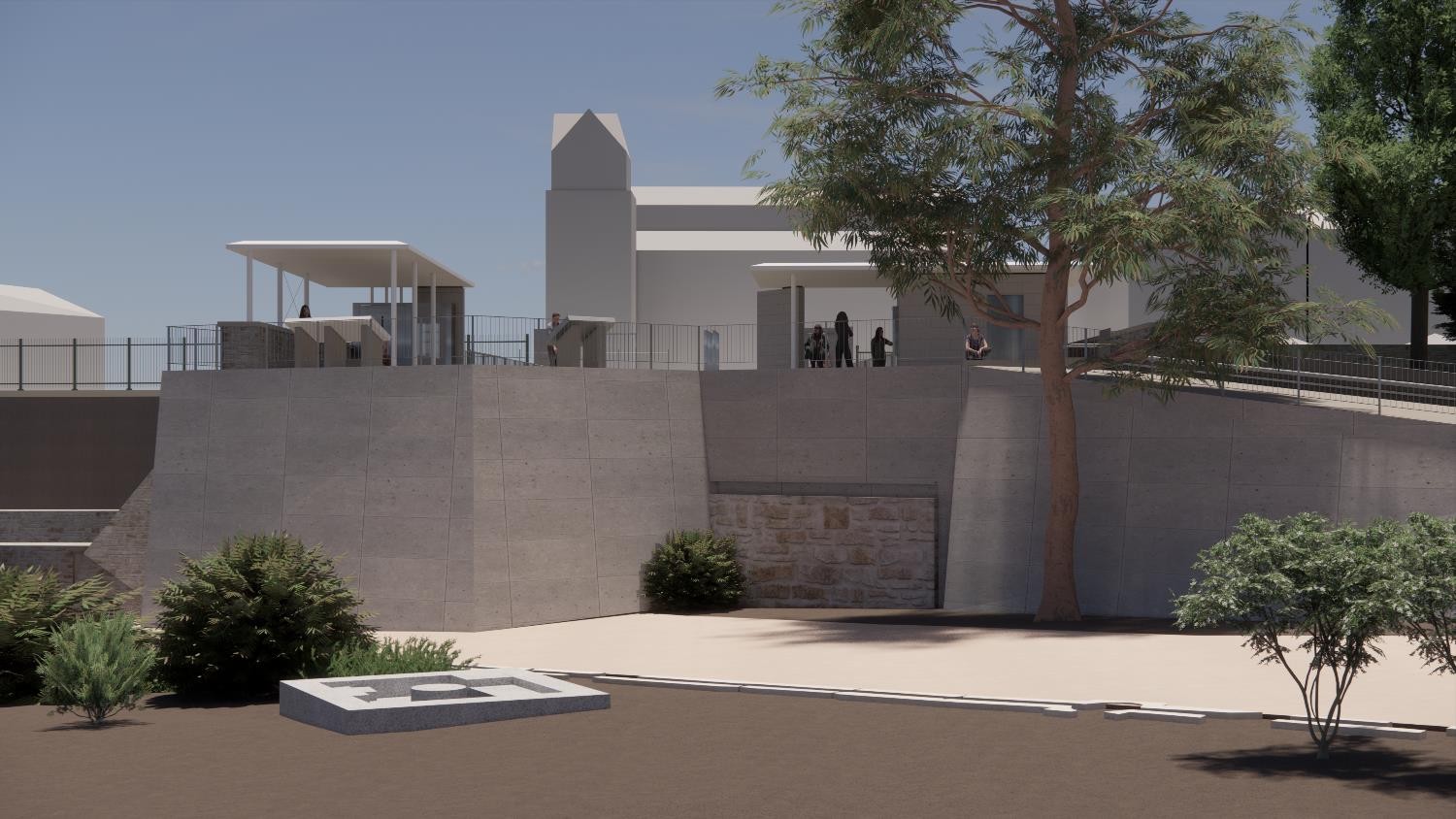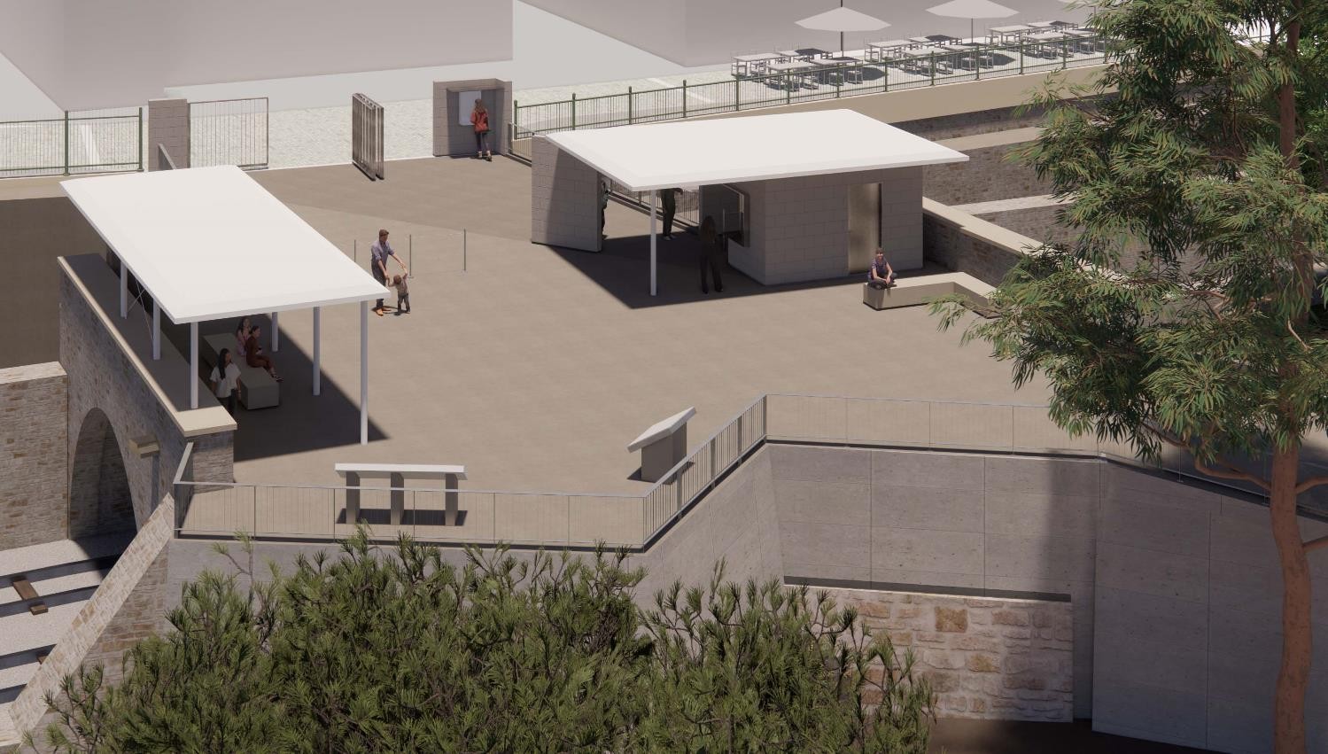 Στην είσοδο επί της οδού Αποστόλου Παύλου αναβαθμίζεται το υφιστάμενο εκδοτήριο και κατασκευάζεται στέγαστρο για τη σκίαση των επισκεπτών, κατά τη διαδικασία έκδοσης εισιτηρίων, του αυτόματου πωλητή νερού και του εκδοτηρίου e-ticket. Για τους χώρους υγιεινής προτείνεται ολική ανακαίνιση των υφιστάμενων εγκαταστάσεων, με προσθήκη νέων, με προδιαγραφές και για ΑμεΑ, αλλά και η αντικατάσταση των παλαιών δικτύων ύδρευσης και αποχέτευσης. Όσον αφορά στον εξοπλισμό, προτείνονται νέοι στύλοι περισχοίνισης, νέες πληροφοριακές πινακίδες, νέα καθιστικά και νέα κιγκλιδώματα.