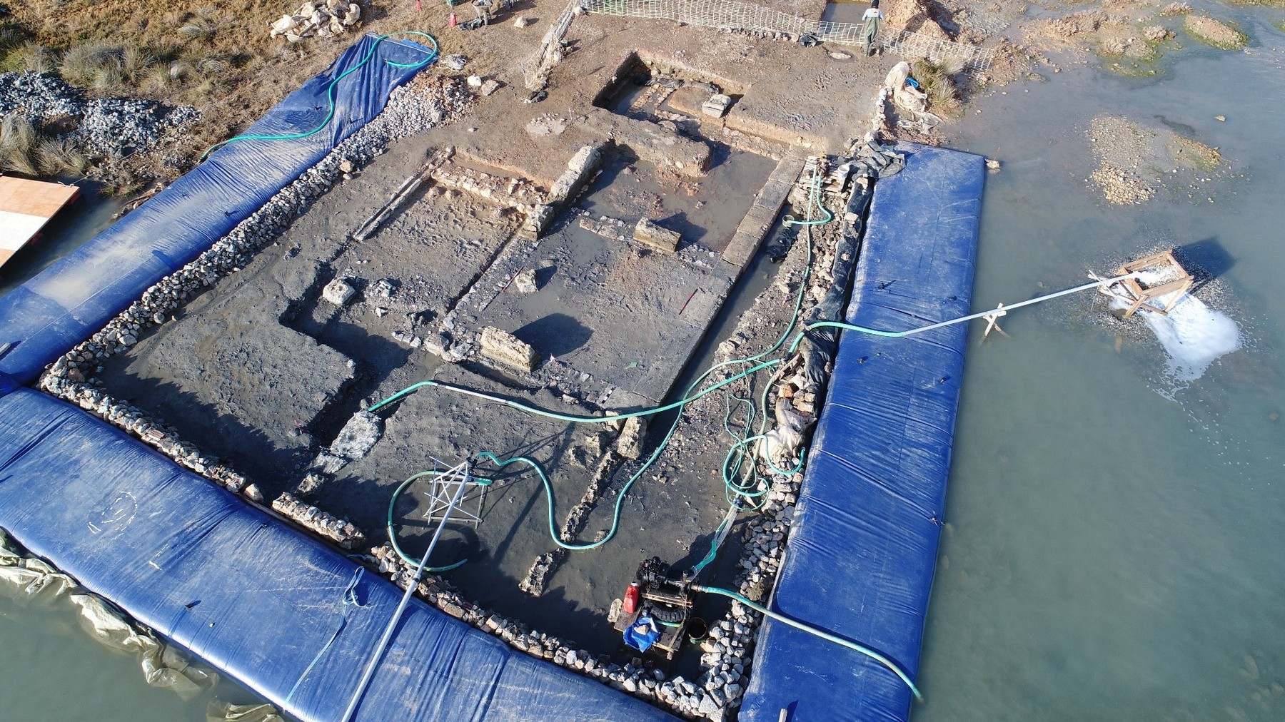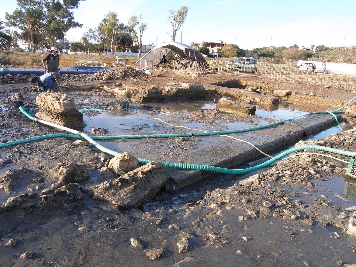 Η διερεύνηση του καταβυθισμένου τμήματος του κτηρίου, προσαρμοσμένη σε κάναβο με τετράγωνα 4 x4 μ., πραγματοποιήθηκε σε δύσκολο βουρκώδες περιβάλλον με την εφαρμογή, και πάλι, 'αμφίβιας' ανασκαφικής τεχνικής, η οποία συνδυάζει μεθόδους και πρακτικές της χερσαίας και της υποβρύχιας Αρχαιολογίας και επιτεύχθηκε με την τοποθέτηση ειδικού εύκαμπτου υδατοφράκτη και την χρησιμοποίηση 3 υδραντλιών για την καθημερινή απάντληση των υδάτων και την αφαίρεση των ιζημάτων σε θαλάσσιο πεδίο συνολικής εκτάσεως 190 τ.μ.