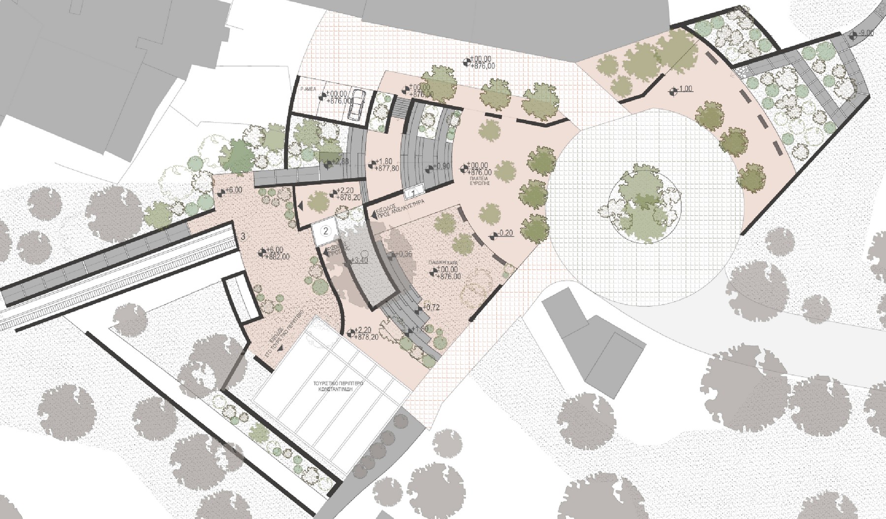 Η διαμόρφωση και η ανάπλαση της Πλατείας Ευρώπης και της ευρύτερης ζώνης αναδεικνύεται ως πόλος έλξης και ανάπαυσης για τους επισκέπτες του αρχαιολογικού χώρου όλων των ηλικιών, με τη δημιουργία καθιστικών, χώρων πράσινου και χώρων υγιεινής, την απομάκρυνση του χώρου στάθμευσης και την χωροθέτησή του σε κοντινά σημεία, την ένταξη της αφετηρίας του αναβατορίου για τη μετακίνηση των επισκεπτών ΑμεΑ, την αποκατάσταση των υφιστάμενων μονοπατιών με παράλληλη εγκατάσταση αποστραγγιστικού δικτύου. Στην αρχιτεκτονική πρόταση εξετάζονται η συμπερίληψη του κτηρίου του τουριστικού περιπτέρου Ξενία στην ανάπλαση της Πλατείας Ευρώπης και στην επανάχρησή του ως χώρο πολιτισμού και ενημέρωσης, η πρόσβαση των επισκεπτών ΑμεΑ σε όλες τις στάθμες ενδιαφέροντος της Πλατείας (αφετηρία αναβατορίου και είσοδος στο Τουριστικό Περίπτερο Ξενία) με κατακόρυφο ανελκυστήρα, η δημιουργία στεγασμένων θέσεων στάσης και ανάπαυσης των όνων και των οδηγών τους που μεταφέρουν επισκέπτες από την Πλατεία Ευρώπης στο Σπήλαιο.