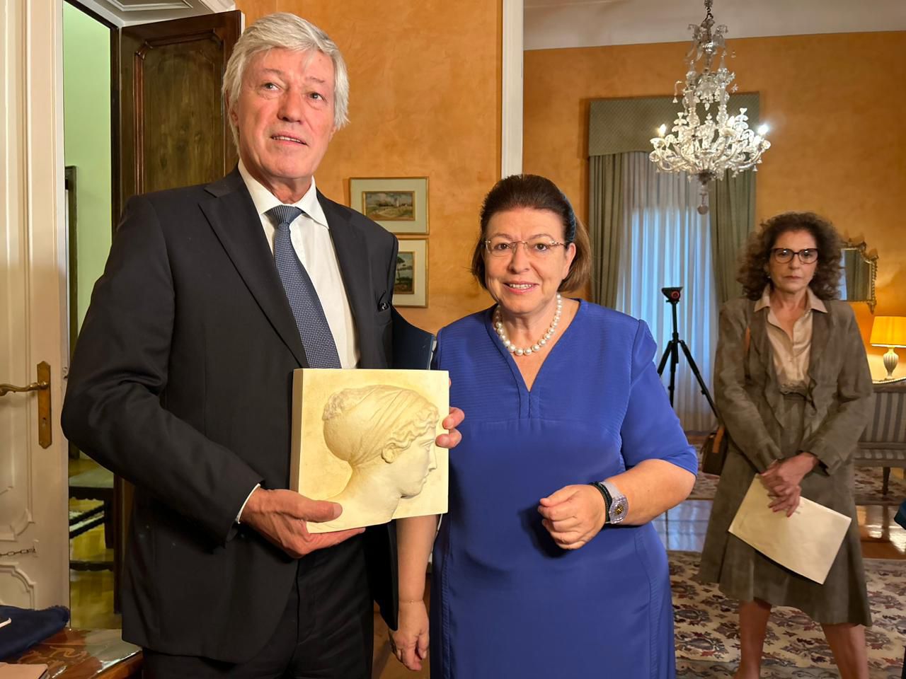 Η Πρεσβεία της Ελλάδας στη Ρώμη συνέδραμε τον κ. De Gasperi στις σχετικές συνεννοήσεις με την ιταλική αρχαιολογική υπηρεσία, προκειμένου να εγκριθεί η δωρεά και η εξαγωγή του αγγείου στην Ελλάδα. Στην τελετή παρέστησαν η Πρέσβης κ. Ελένη Σουρανή, η οικογένεια του κ. De Gasperi, η Υπεύθυνη Εξαγωγών Αρχαιοτήτων του Υπουργείου Πολιτισμού της Ιταλίας Δρ. Antonella Bonini, ενώ την Λίνα Μενδώνη συνόδευε η Προϊσταμένη της Διεύθυνσης Τεκμηρίωσης και Προστασίας Πολιτιστικών Αγαθών Βασιλική Παπαγεωργίου.