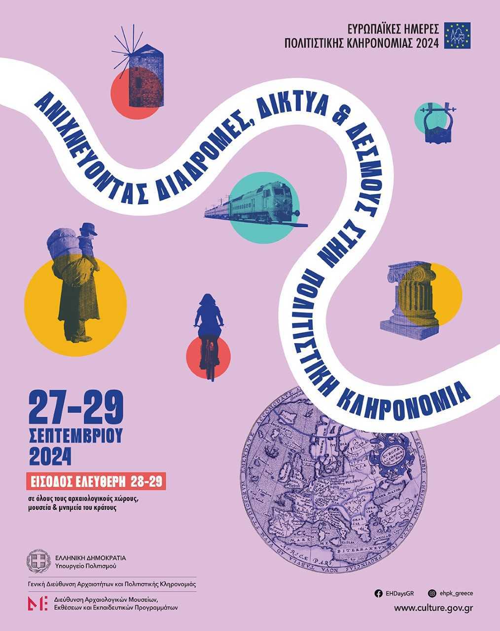 Στις 27-29 Σεπτεμβρίου 2024 το Υπουργείο Πολιτισμού γιορτάζει για 28η χρονιά τις Ευρωπαϊκές Ημέρες Πολιτιστικής Κληρονομιάς. Φέτος, το κοινό ευρωπαϊκό θέμα του εορτασμού είναι «Ανιχνεύοντας Διαδρομές, Δίκτυα και Δεσμούς στην Πολιτιστική Κληρονομιά» (European Heritage Days 2024: Routes, Networks and Connections).