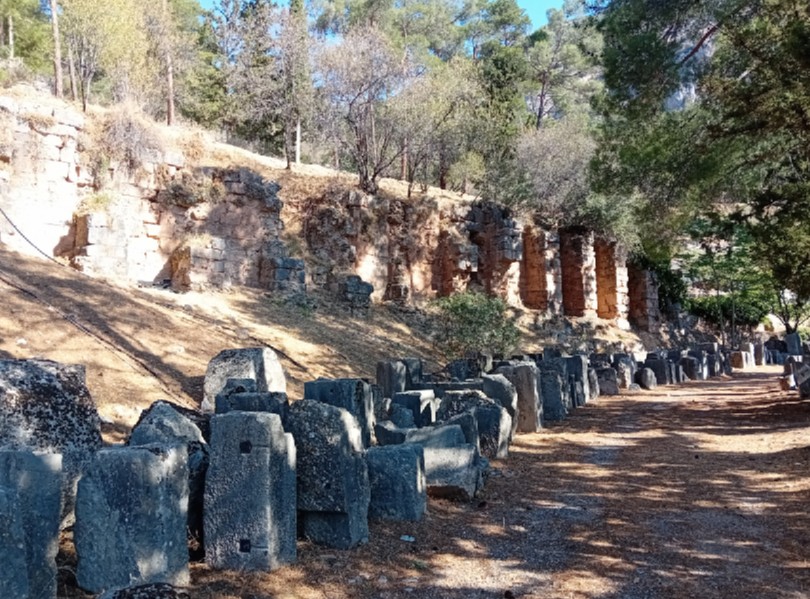 Στα δυτικά του περιβόλου του τεμένους του Απόλλωνος, σε πλάτωμα εμβαδού 2000 τ.μ., σώζονται τα κατάλοιπα της Δυτικής Στοάς, ενός από τα πιο επιβλητικά μνημεία, που, σήμερα, δεν εντάσσεται στον οργανωμένο και επισκέψιμο αρχαιολογικό χώρο Δελφών. Στην αρχαιότητα αποτελούσε σημαντικό χώρο και μνημειακή είσοδο των επισκεπτών προς τον Ναό του Απόλλωνα και προς το θέατρο. Η πρώτη φάση της Στοάς χρονολογήθηκε στον 4ο αιώνα π.Χ. και αναγνωρίστηκε ως η Οπλοθήκη του τεμένους. Έφερε διπλή κιονοστοιχία με 29 κίονες εξωτερικά και 15 εσωτερικά, οι οποίοι δεν σώζονται σήμερα. Η Δυτική Στοά εκκενώθηκε μετά τη μερική καταστροφή της. Τη ρωμαϊκή περίοδο μέρος της μετατράπηκε σε οικία με ιδιωτικές θέρμες. Εδώ, σώζεται και η μεγάλη κινστέρνα, η οποία κάλυπτε τις αυξημένες ανάγκες ύδρευσης του οικισμού και λειτουργίας των λουτρών.