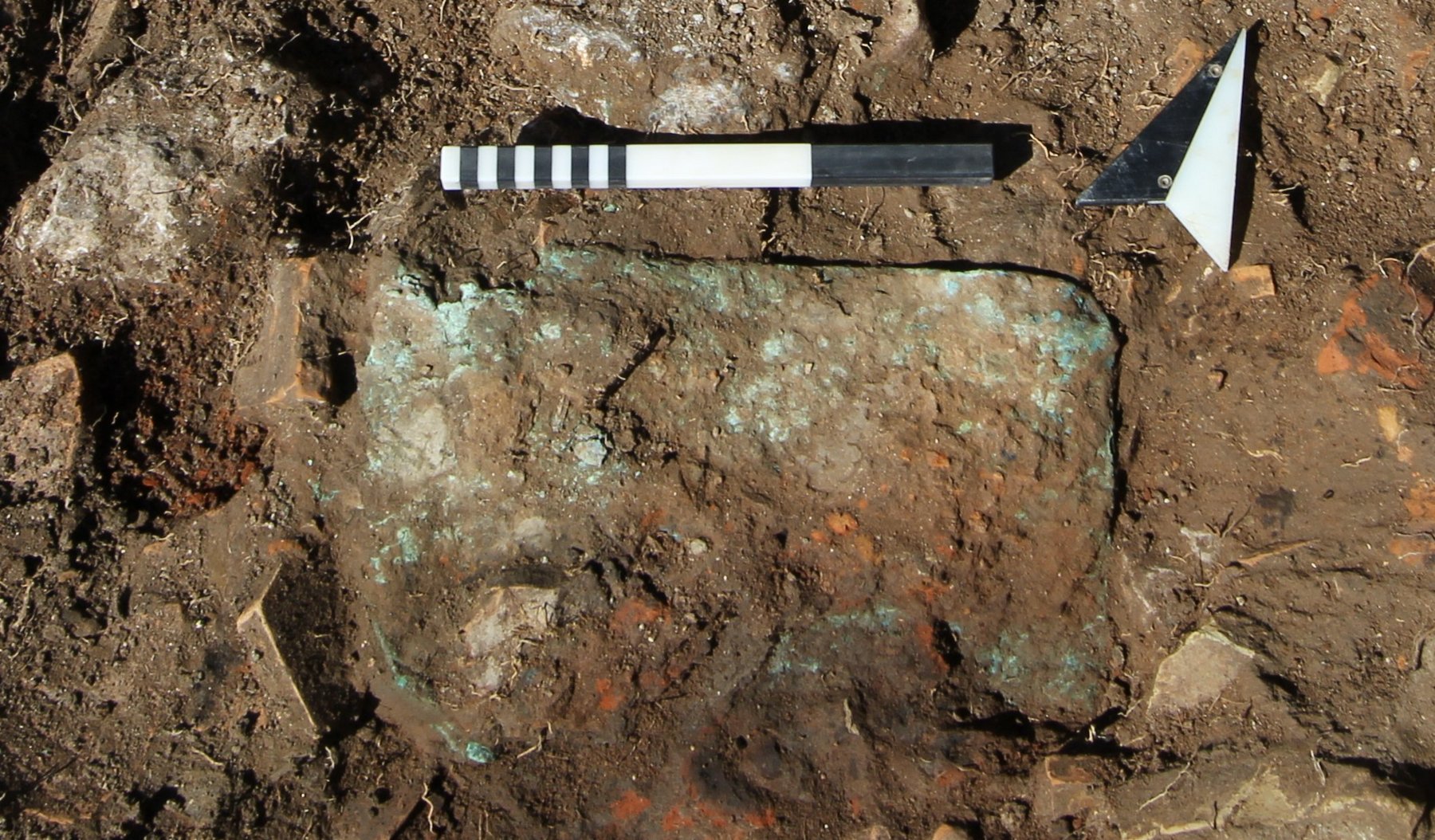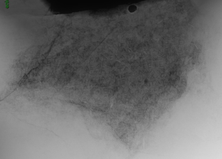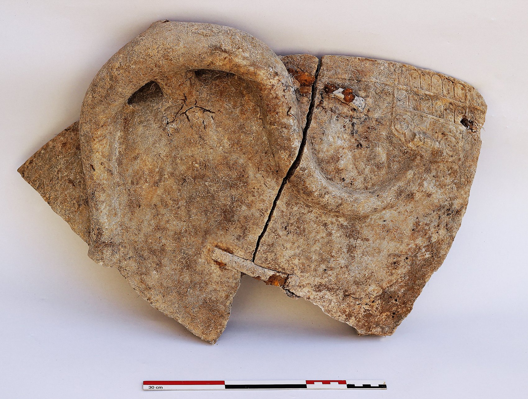 Στη δεύτερη αίθουσα, πάνω στο δάπεδο βρέθηκαν τα θραύσματα αρχαϊκού μαρμάρινου περιρραντηρίου διαμέτρου περίπου 1 μέτρου (Εικ. 3). Πρόκειται για σκεύος τελετουργικού καθαρισμού που μιμείται χάλκινη λεκάνη και είχε επισκευασθεί ήδη στην αρχαιότητα, όπως φανερώνουν οι μεταλλικοί σύνδεσμοι που συγκρατούν τα θραυσμένα τμήματά του (Εικ. 4). Μαζί με το θραύσμα που ανακαλύφθηκε το 2022, το εντυπωσιακό σκεύος μπορεί πλέον να αποκατασταθεί σχεδόν στο σύνολό του. Σημαντικό εύρημα της φετινής ανασκαφής είναι χάλκινο έλασμα που πιθανώς ήταν ανηρτημένο σε τοίχο του ναού (Εικ. 5). Η απεικονιστική διαγνωστική εξέταση του αντικειμένου φανέρωσε ότι η μία όψη της χάλκινης πλάκας διασώζει μεγάλη επιγραφή (Εικ. 6), η οποία αναμένεται ότι θα αποκαλυφθεί πλήρως κατά τη συντήρησή της στο εργαστήριο της Εφορείας Αρχαιοτήτων Ηλείας.