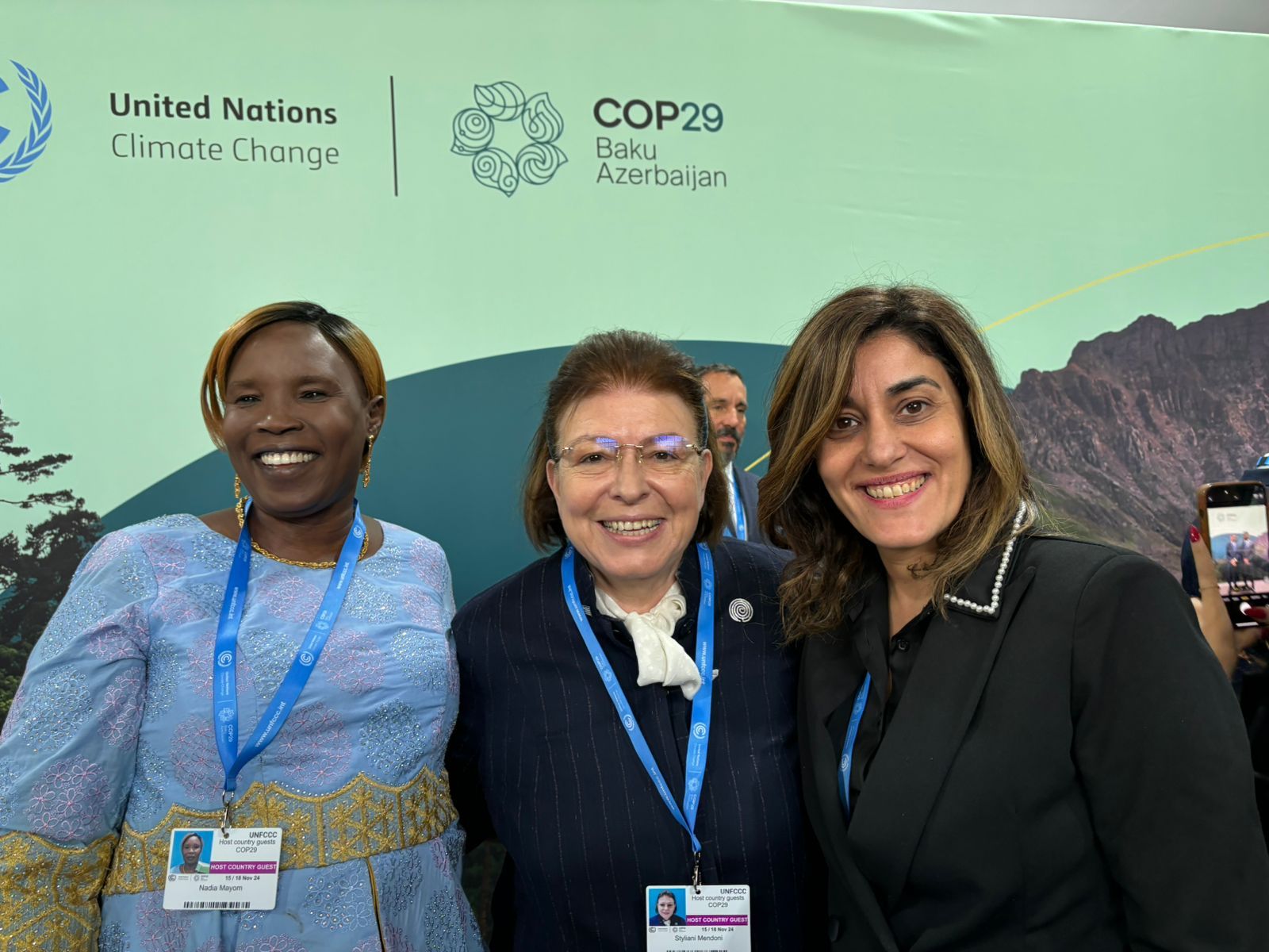 Μετά το πέρας του 2ου Υψηλού Επιπέδου Υπουργικού Διαλόγου για την Κλιματική Κρίση με βάση τον Πολιτισμό, η Λίνα Μενδώνη μετέβη, συνοδευόμενη από τον Πρέσβη της Ελλάδας, στο Αζερμπαϊτζάν, Χρήστο Καποδίστρια, στο Ελληνικό Περίπτερο στην COP29, όπου πραγματοποιήθηκαν περισσότερες από 45 εκδηλώσεις, με τη συμμετοχή αρχηγών κρατών, υπουργών και κυβερνητικών αξιωματούχων από δεκάδες χώρες, καθώς επίσης ακαδημαϊκών, εκπροσώπων εταιρειών και της κοινωνίας των πολιτών. Στο ελληνικό περίπτερο, το Υπουργείο Πολιτισμού οργάνωσε ειδική εκδήλωση με θέμα «Προστατεύοντας την Πολιτιστική Κληρονομιά από τις επιπτώσεις της Κλιματικής Αλλαγής: Προκλήσεις και Καλές Πρακτικές». Στην εκδήλωση συμμετείχαν η Πριγκίπισσα Dana Firas της Ιορδανίας, Πρέσβειρα Καλής Θέλησης της UNESCO για την Πολιτιστική Κληρονομιά, η Διευθύντρια του World Monument Fund για θέματα προσαρμογής Meredith Wiggins, ο Κωσταντίνος Καρτάλης Καθηγητής του ΕΚΠΑ και μέλος της Επιστημονικής Επιτροπής της Ευρωπαϊκής Ένωσης για θέματα Κλιματικής Αλλαγής και η Σοφία Σπυροπούλου, Αρχαιολόγος στο Υπουργείο Πολιτισμού. Στη συζήτηση επισημάνθηκαν η ανάγκη για προληπτική δράση για την προστασία των αρχαιολογικών χώρων και μνημείων στις επιπτώσεις της κλιματικής αλλαγής, η αξιοποίηση της επιστημονικής γνώσης για την εκτίμηση της τρωτότητας και των κινδύνων της πολιτιστικής κληρονομιάς, η έλλειψη τεχνογνωσίας σε αρκετές χώρες, η περιορισμένη ενσωμάτωση της διάστασης του πολιτισμού στα Εθνικά Σχέδια Προσαρμογής στην Κλιματική Αλλαγή, καθώς και η περιορισμένη συμμετοχή των τοπικών κοινωνιών στην κατάρτιση των Σχεδίων Προσαρμογής. Σε ότι αφορά στις καλές πρακτικές, επισημάνθηκε η ανάγκη για τη σύνδεση της φυσικής και της πολιτιστικής κληρονομιάς, η αξιοποίηση νέων εργαλείων (κλιματικά μοντέλα, ψηφιακές εφαρμογές), η ενσωμάτωση τοπικών και παραδοσιακών πρακτικών στα Σχέδια Προσαρμογής, αλλά και η συνεισφορά των πολιτιστικών και δημιουργικών τομέων στην πράσινη μετάβαση. Τέλος, παρουσιάστηκε ως καλή πρακτική η συνεργασία του Υπουργείου Πολιτισμού και του Υπουργείου Κλιματικής Κρίσης της  Ελλάδας, για την προληπτική προστασία 50 αρχαιολογικών χώρων από τις δασικές πυρκαγιές, καθώς και η δομή και οι στόχοι της ψηφιακής πλατφόρμας του Υπουργείου Πολιτισμού για την εκτίμηση των κλιματικών κινδύνων για τους αρχαιολογικούς χώρους και τα μνημεία σε επίπεδο επικράτειας.