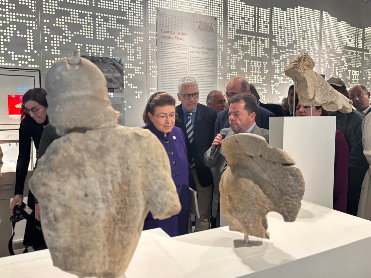 Στον χαιρετισμό της η Λίνα Μενδώνη σημείωσε  ότι «Το Υπουργείο Πολιτισμού, δια της Εφορείας Αρχαιοτήτων Αχαΐας, αποδίδουν  στο Αίγιο και την ευρύτερη περιοχή, ένα εξαιρετικά σημαντικό αρχαιολογικό μουσείο. Το Αίγιο και η Αιγιάλεια διαθέτουν έναν αδιάλειπτο πολιτισμικό πλούτο, από τη Νεολιθική εποχή μέχρι τις μέρες μας, και έχουν όλες τις δυνατότητες να αποτελέσουν έναν προορισμό αναφοράς, στο πλαίσιο του πολιτιστικού τουρισμού. Το Υπουργείο Πολιτισμού δίδει ιδιαίτερη σημασία στην περιοχή, καθώς το Μουσείο τους Αιγίου αποτελεί σημαντικό σταθμό στο πλαίσιο της μίας εκ των πέντε Πολιτιστικών Διαδρομών, τις οποίες υλοποιούν οι αρμόδιες υπηρεσίες με πόρους του Ταμείου Ανάκαμψης. Το εργαλείο των πολιτιστικών διαδρομών είναι αυτό το οποίο αναδεικνύει και κατ΄εξοχήν προβάλλει τον θεματικό και πολιτιστικό τουρισμό, ο οποίος συμβάλλει καθοριστικά στην τοπική οικονομική ανάπτυξη, δημιουργώντας παράλληλα και νέες θέσεις εργασίας. Η διαφύλαξη, η προστασία και η ανάδειξη της πολιτιστικής μας κληρονομιάς αποτελεί υποχρέωση και προτεραιότητα για μας. Τα αποτελέσματα της αποδοτικής και αποτελεσματικής μας συνεργασίας με την Περιφέρεια Δυτικής Ελλάδας και τον Περιφερειάρχη Νεκτάριο Φαρμάκη είναι απτά και συγκεκριμένα. Οι δύσκολοι και γεμάτοι προκλήσεις καιροί απαιτούν την ανάπτυξη συνεργασιών και συνεργειών. Αυτό το έχουμε πετύχει στο μέγιστο βαθμό, από την πρώτη στιγμή, με την Περιφέρεια Δυτικής Ελλάδας επ' ωφελεία του πολιτιστικού μας αποθέματος και της τοπικής κοινωνίας».