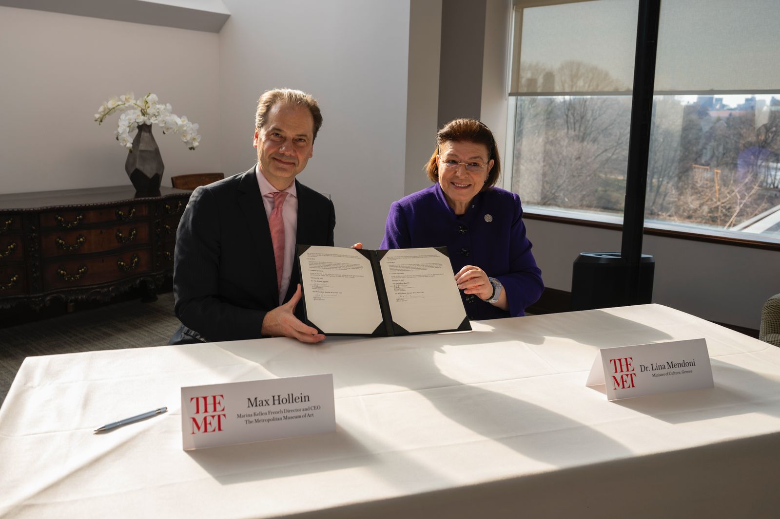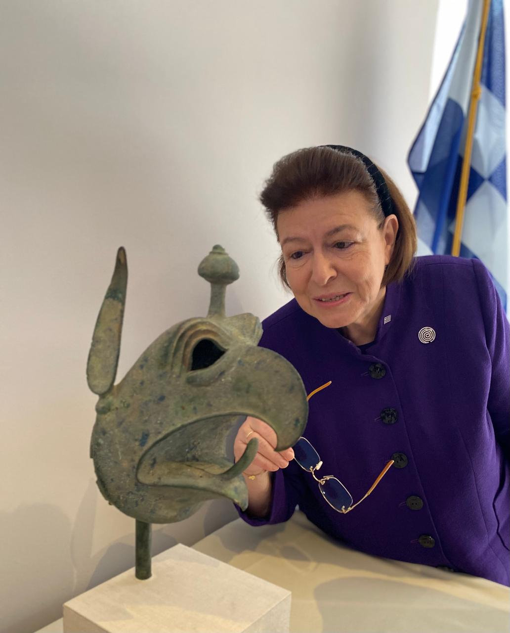 Σε ειδική τελετή, που διοργανώθηκε στο Μητροπολιτικό Μουσείο της Νέας Υόρκης, η Υπουργός Πολιτισμού Λίνα Μενδώνη παρέλαβε από τον Διευθυντή του ΜΕΤ Max Hollein την χάλκινη κεφαλή του γρύπα από την Αρχαία Ολυμπία, που μέχρι χθες κατείχε περίοπτη θέση στην πτέρυγα της Συλλογής των Ελληνικών και των Ρωμαϊκών Αρχαιοτήτων.