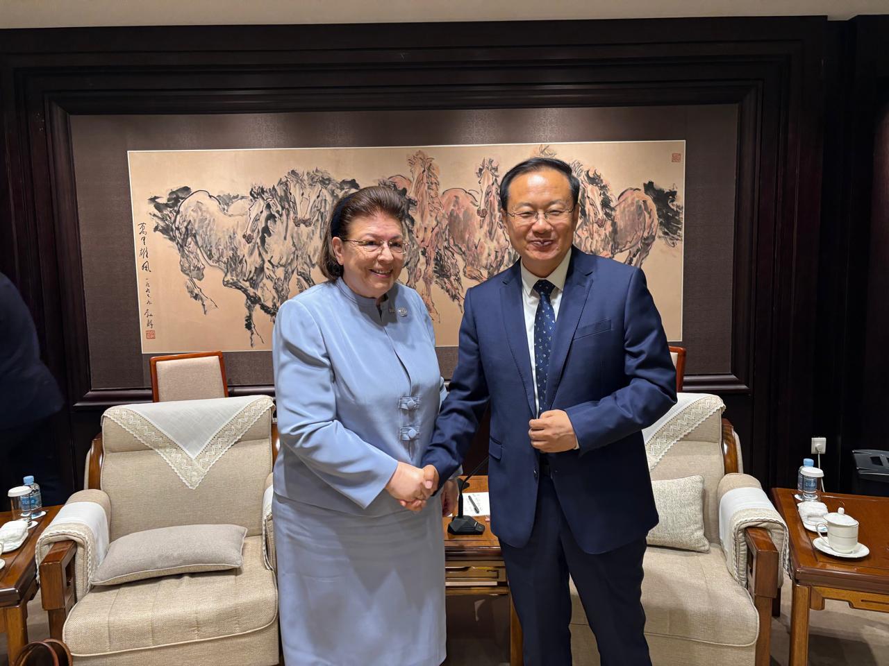 Στο πλαίσιο της επίσημης επίσκεψής της στην Κίνα, η Υπουργός Πολιτισμού Λίνα Μενδώνη πραγματοποίησε συνάντηση εργασίας με τον Υπουργό Πολιτισμού και Τουρισμού της Λαϊκής Δημοκρατίας της Κίνας Sun Yeli, στο Πεκίνο.