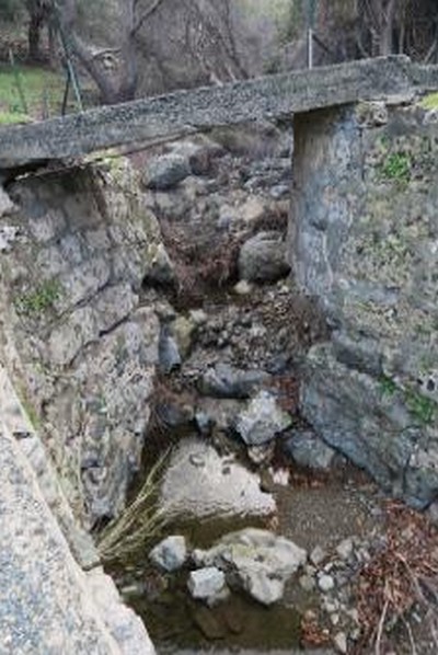 β) Ζώνη ρέματος Αγίας Παρασκευής, κοντά στο κτήριο των χώρων υγιεινής των επισκεπτών και στην όμορη κατεστραμμένη λιθόστρωτη διάβαση,