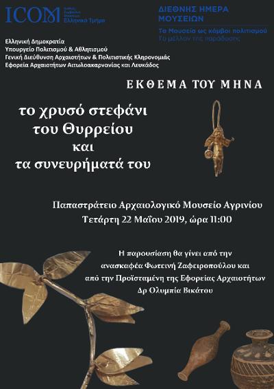 Η Εφορεία Αρχαιοτήτων Αιτωλοακαρνανίας και Λευκάδος με αφορμή τον εορτασμό της Διεθνούς Ημέρας Μουσείων διοργανώνει την Τετάρτη 22 Μαΐου 2019 και ώρα 11:00 στο Παπαστράτειο Αρχαιολογικό Μουσείο Αγρινίου εκδήλωση για το Έκθεμα του Μήνα, κατά την οποία θα παρουσιαστεί για πρώτη φορά στο ευρύ κοινό μετά την ανακάλυψή του το 1973, το χρυσό στεφάνι του Θυρρείου και τα συνευρήματά του. Το σπουδαίο αυτό ανασκαφικό σύνολο εντοπίστηκε σε κιβωτιόσχημο τάφο, που ερευνήθηκε κατά τη διάρκεια εργασιών διάνοιξης υδρευτικής αύλακας εντός του Θυρρείου και περιείχε μια πλούσια κτερισμένη γυναικεία ταφή της ελληνιστικής περιόδου (α΄ μισό 2ου αι. π.Χ.) και μία μεταγενέστερη ταφή-καύση των αυτοκρατορικών χρόνων (1ος-2ος αι. μ.Χ.). Η νεκρή έφερε χρυσό στεφάνι από φύλλα μυρτιάς στην κεφαλή και χρυσό ενώτιο. Τα υπόλοιπα κτερίσματα, τρεις χάλκινοι καθρέφτες, σιδερένια στλεγγίδα, δύο θαλάσσιες αχιβάδες και 26 πήλινα αγγεία (λύχνοι, αρύβαλλοι, κυάθια, σκυφίδια, μυροδοχεία, πυξίδες κ.ά.) βρέθηκαν συγκεντρωμένα στα πόδια της. Η μεταγενέστερη ταφή-καύση των αυτοκρατορικών χρόνων βρέθηκε μέσα σε μόνωτη χύτρα, η οποία περιείχε τα καμένα οστά και ένα μικρό γυάλινο αγγείο.Η παρουσίαση του εκθέματος θα γίνει από την Επίτιμη Διευθύντρια Αρχαιοτήτων και ανασκαφέα Φωτεινή Ζαφειροπούλου και την Προϊσταμένη της Εφορείας Αρχαιοτήτων Δρ Ολυμπία Βικάτου. Θα ακολουθήσει ξενάγηση στους εκθεσιακούς χώρους του Μουσείου από αρχαιολόγους της Εφορείας. Κατά την εκδήλωση θα τιμηθεί η Επίτιμη Έφορος Αρχαιοτήτων Φωτεινή Ζαφειροπούλου για τη συμβολή της στην έρευνα, προστασία και ανάδειξη της πολιτιστικής κληρονομιάς της Αιτωλοακαρνανίας.Το Αρχαιολογικό Μουσείο Αγρινίου θα παραμένει ανοιχτό για τους επισκέπτες καθημερινά εκτός Τρίτης (8:00-15:30).