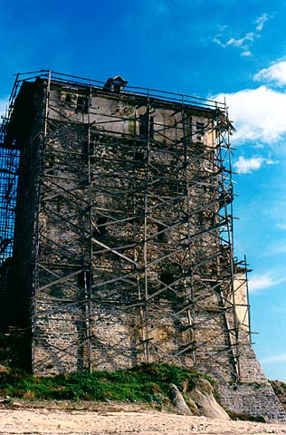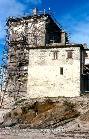 Η πρώτη στερεωτική επέμβαση έχει γίνει στον πύργο της Ουρανούπολης (Προσφορίου) το 1975 και συνίστατο στην έμφραξη των ρωγμών, την αρμολόγηση και την περίδεσή του σε τέσσερις στάθμες καθ' ύψος. Χρησιμοποιήθηκαν τότε ελκυστήρες και αγκυρώσεις από κοινό οικοδομικό χάλυβα, στοιχεία τα οποία πολύ σύντομα διαβρώθηκαν λόγω των δυσμενών συνθηκών του παραθαλάσσιου μνημείου, και σχεδόν αχρηστεύθηκαν.