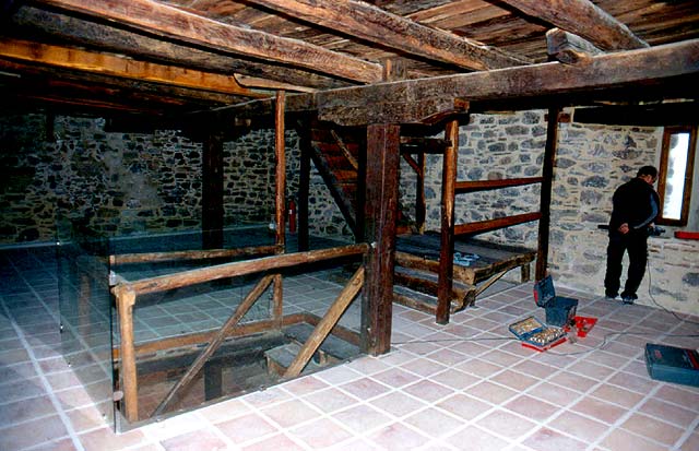 Η ίδια αρχή κατηύθυνε και τις επεμβάσεις στους εσωτερικούς ξυλόπηκτους τοίχους, όπου διατηρήθηκαν πολλά παλιά επιχρίσματα. Με τον ίδιο τρόπο αντικαταστάθηκαν ή συμπληρώθηκαν και τα λοιπά ξύλινα αρχιτεκτονικά στοιχεία του εσωτερικού (σκάλες, κιγκλιδώματα, κουφώματα).
