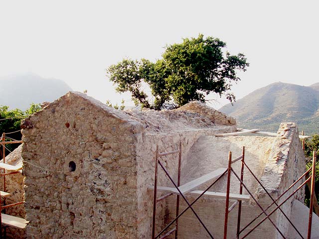 • Καθαίρεση της κεράμωσης, που είχε κατασκευαστεί το 1974. Κάτω από αυτήν αποκαλύφθηκε τσιμεντοκονία επικάλυψης ενός στρώματος από χαλίκια και πηλοκονίαμα, σαθρού και ρηγματωμένου, που έφταναν μέχρι το εξωρράχιο των θόλων. Δεν σώθηκαν υπολείμματα παλαιότερης κεράμωσης. Μετά την καθαίρεση του στρώματος αυτού έγινε καλός καθαρισμός του εξωρραχίου, συρραφές των έντονων ρωγμών, κονίαμα υποστρώματος και νέα κεράμωση με κεραμίδια βυζαντινού τύπου