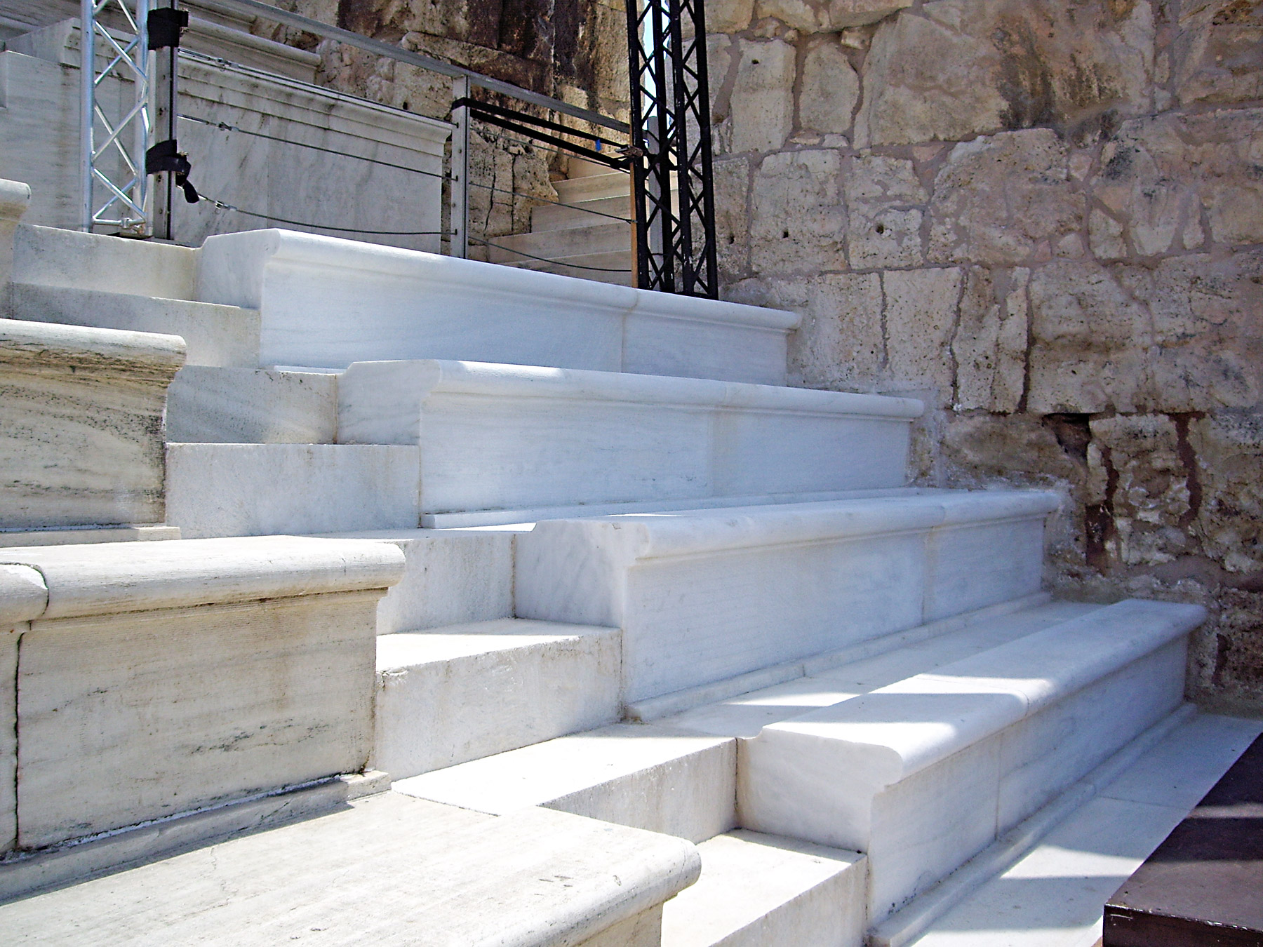 1. Επάνω από την ανατολική πάροδο τοποθετήθηκαν, με την βοήθεια τηλεσκοπικού γερανού, έξι νέα εδώλια συνολικού μήκους 9,60 μ., αφού διαμορφώθηκαν διά χειρός τα κυμάτια και η λάξευση του μετώπου τους. Μετά την τελική προσαρμογή των εδωλίων διαμορφώθηκε και λαξεύτηκε δια χειρός η οριζόντια επιφάνειά τους, ενώ παράλληλα συμπληρώθηκε με νέο πεντελικό μάρμαρο ο διάδρομος πάνω από την έκτη και τελευταία σειρά νέων εδωλίων και τοποθετήθηκε το ανοξείδωτο κιγκλίδωμα.