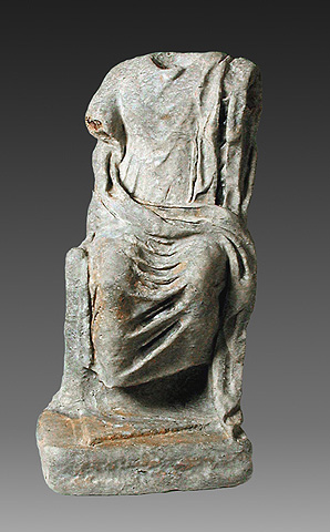 2. Άγαλμα καθιστής ανδρικής μορφής, στον τύπο του θεού Σάραπη ή Σέραπη. Η θεότητα αυτή δημιουργήθηκε στα χρόνια των ελληνιστικών βασιλείων με πρότυπο το διάσημο λατρευτικό άγαλμα στο ιερό της Αλεξάνδρειας στην Αίγυπτο, του 3ου αι. π.Χ. Το άγαλμα της Κεφαλονιάς, παρά την ελλιπή του διατήρηση, παρουσιάζει τα βασικά χαρακτηριστικά: ο θεός, καθιστός σε θρόνο, φορά χιτώνα με κοντές χειρίδες (μανίκια) και ιμάτιο που τυλίγεται στους μηρούς. Ο τύπος αυτός συνοδευόταν από τον φοβερό σκύλο Κέρβερο, από τον οποίο στην προκειμένη περίπτωση δεν σώζεται παρά μόνο η προεξοχή στη βάση όπου θα στεκόταν.