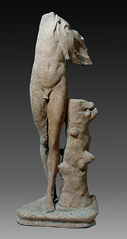 3. Μια άλλη εκδοχή Σάτυρου είναι και αυτή που απεικονίζει όρθιο γυμνό νέο που φορά κοντή χλαμύδα ή δορά ζώου. Η ψηλόλιγνη ακέφαλη μορφή συστρέφει το σώμα σε μια σχεδόν χορευτική κίνηση. Οι Σάτυροι, οι Μαινάδες, οι Νύμφες και άλλες μορφές από τον διονυσιακό θίασο σε χαριτωμένα συμπλέγματα αποτελούσαν αγαπημένο θέμα της ελληνιστικής γλυπτικής και αργότερα, συχνή επιλογή για την διακόσμηση των κήπων στις πλούσιες ρωμαϊκές επαύλεις, γεγονός που θα δικαιολογούσε τόσο την προέλευση όσο και τον προορισμό των συγκεκριμένων έργων που βρέθηκαν στο Ξι.