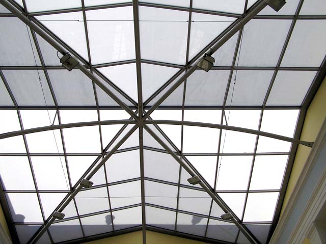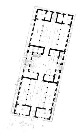 Τα τρία μέρη του κτιρίου, ένα κεντρικό και δύο πλευρικά, διατάσσονται συμμετρικά και σε συνέχεια κατά μήκους του μακρύτερου άξονα, σχηματίζοντας αντίστοιχα αίθρια.