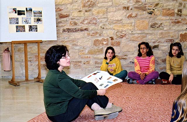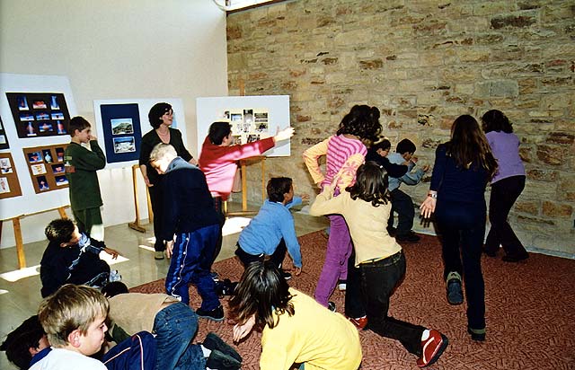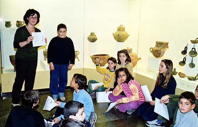 Μία εκπαιδεύτρια αναλαμβάνει να ξεναγήσει τους μαθητές στις αίθουσες του Μουσείου, χρησιμοποιώντας ως εποπτικό υλικό τα ίδια τα εκθέματα και φωτογραφίες.