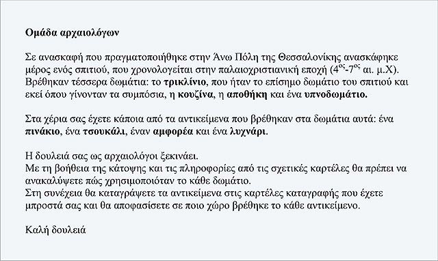 Στο πρώτο μέρος του προγράμματος γίνεται η γνωριμία τω μαθητών με τις μουσειοπαιδαγωγούς, μια σύντομη ενημέρωση σχετικά με το Μουσείο και έπειτα οι μαθητές πληροφορούνται γενικά για την επιστήμη της αρχαιολογίας, τη σύγχρονη ανασκαφική πρακτική και την έννοια του μουσείου με τη χρήση εποπτικού υλικού (φωτογραφίες) και τη διαλογική συζήτηση. Αφού ολοκληρωθεί η συζήτηση, οι μαθητές χωρίζονται σε ομάδες και οδηγούνται στο χώρο των εκπαιδευτικών προγραμμάτων.