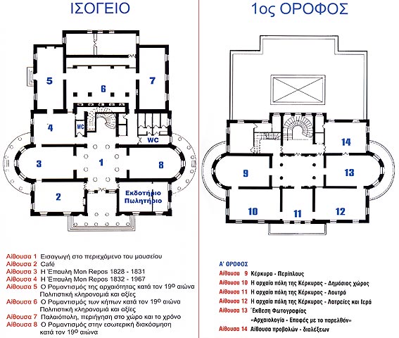 ΙΣΟΓΕΙΟ: Αίθουσα 1. Είσοδος: Εισαγωγή των επισκεπτών στο σκοπό, τους στόχους και τη φυσιογνωμία του Μουσείου. Αίθουσα 2: Cafe. Χώρος συζήτησης και αναψυχής, με επίπλωση στο στυλ του 19ου αι. Αίθουσα 3: Παρουσίαση του ιστορικού ανέγερσης του κτηρίου και της ζωής του πρώτου ενοίκου του, Άγγλου Ύπατου Αρμοστή Adam. Αίθουσα 4: Η ιστορία του κτηρίου από το 1832 ως το 1967 και οι χρήσεις του από την εποχή ίδρυσής του ως την εγκατάλειψή του. Αίθουσα 5: Παρουσίαση του ιστορικού των ανασκαφικών ερευνών στο χώρο της Παλαιόπολης και της σημασίας τους για την μετέπειτα ερευνητική δουλειά στο χώρο. Αίθουσα 6: Η περίοδος του ρομαντισμού, η ιδεολογία και μορφολογία των κήπων κατά το 19ο αιώνα. Αίθουσα 7: Παρουσίαση της τοπογραφίας και της χρονολογικής εξέλιξης της αρχαίας Κέρκυρας, μέσω μακέτας της χερσονήσου του Κανονιού, χρονολογίου και φωτογραφιών. Αίθουσα 8: Η περίοδος της Αντιβασιλείας (Regency Style) στην Κέρκυρα.