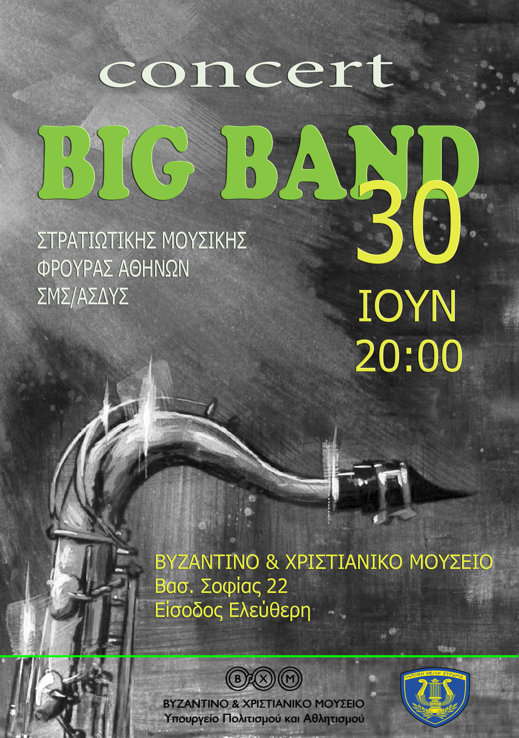Την Πέμπτη 30 Ιουνίου 2016 και ώρα 20:00 το μουσικό σύνολο «Big Band» της Στρατιωτικής Μουσικής Φρουράς Αθηνών θα δώσει συναυλία στον κήπο του Βυζαντινού και Χριστιανικού Μουσείου με γνωστές συνθέσεις της Jazz και Latin μουσικής, συνδυάζοντας την κλασική φόρμα του ύφους με σύγχρονες ενορχηστρώσεις.