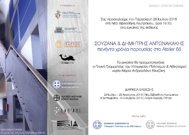 Με αφορμή τη συμπλήρωση πενήντα (50) ετών του Atelier 66 των αρχιτεκτόνων Δημήτρη και Σουζάνας Αντωνακάκη, η πόλη αναγνωρίζει τη μεγάλη προσφορά τους στον Πολιτισμό και ειδικότερα στην Τέχνη της Αρχιτεκτονικής και αναδεικνύει το διεθνώς αναγνωρισμένο έργο τους με την πραγματοποίηση Έκθεσης, διάρκειας από 29 Ιουλίου έως 28 Αυγούστου 2016 στη Νέα Δημοτική Βιβλιοθήκη Λουτρακίου, η οποία στη συνέχεια θα μεταφερθεί στην πόλη της Πάτρας για τον μήνα Σεπτέμβριο 2016.
