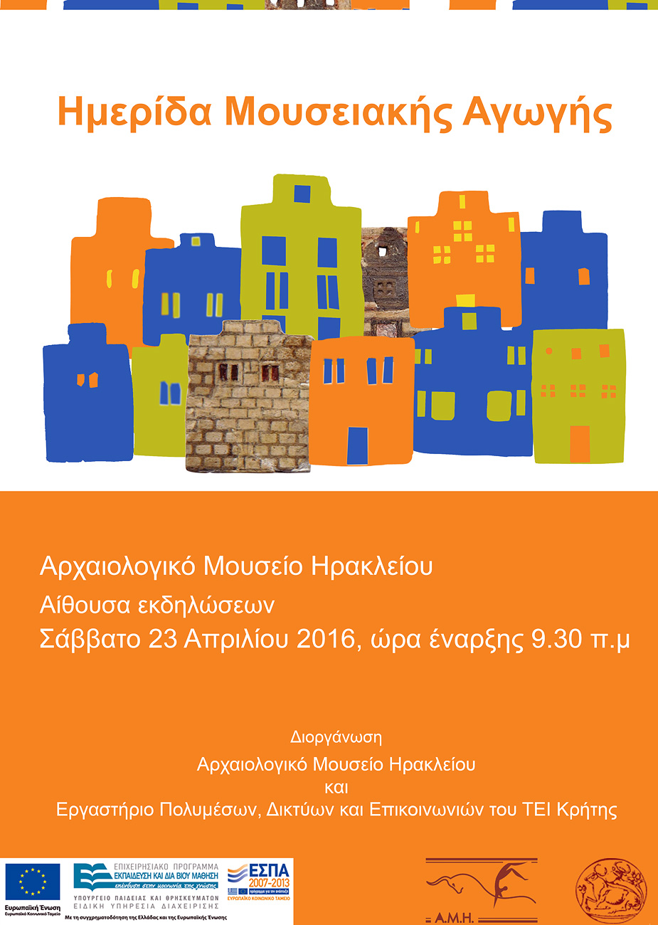 Το Αρχαιολογικό Μουσείο Ηρακλείου και το Εργαστήριο Πολυμέσων, Δικτύων και Επικοινωνιών του Τ.Ε.Ι. διοργανώνει ημερίδα μουσειακής αγωγής που θα πραγματοποιηθεί το Σάββατο 23 Απριλίου 2016 στην αίθουσα εκδηλώσεων του Αρχαιολογικού Μουσείου Ηρακλείου. Στην εκδήλωση θα παρουσιασθούν σύγχρονες θεωρητικές προσεγγίσεις μουσειακής αγωγής, καθώς και δύο ολοκληρωμένα εκπαιδευτικά προγράμματα που σχεδιάστηκαν και υλοποιήθηκαν στο πλαίσιο του Επιχειρησιακού Προγράμματος "Εκπαίδευση και δια βίου μάθηση" του ΕΣΠΑ (Πράξη "Βιωματικά Πολιτισμικά Περιβάλλοντα"), αξιοποιώντας την ψηφιακή τεχνολογία. Σχεδιάστηκαν από ομάδα αρχαιολόγων, μουσειολόγων και τεχνικών πληροφορικής, και υποστηρίζονται από ηλεκτρονικό εξοπλισμό (tablets, οθόνες αφής) και ιστοσελίδα με πληροφοριακό υλικό. Το πρόγραμμα που απευθύνεται στο Δημοτικό έχει ως θεματική «Μια γιορτή στο παλάτι» και στοχεύει να μυήσει τους μικρούς μαθητές στο θαυμαστό μινωικό κόσμο. Στο πρόγραμμα που απευθύνεται στο Γυμνάσιο αναπτύσσεται η θεματική "Ταξιδεύοντας στη Μεσόγειο", με σκοπό την ανάδειξη του ιδιαίτερου ρόλου που διαδραμάτισε η αρχαία Κρήτη στη διακίνηση του εμπορίου από τους μινωικούς χρόνους έως την ύστερη αρχαιότητα.