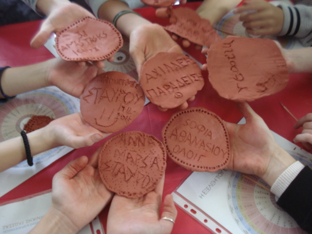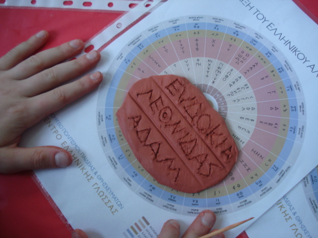 Το πρόγραμμα ολοκληρώνεται με βιωματικό εργαστήριο κατά τη διάρκεια του οποίου, τα παιδιά, με οδηγό διάγραμμα της εξέλιξης του ελληνικού αλφαβήτου, δημιουργούν πήλινες πινακίδες πάνω στις οποίες χαράσσουν το όνομα και το πατρώνυμό τους.
