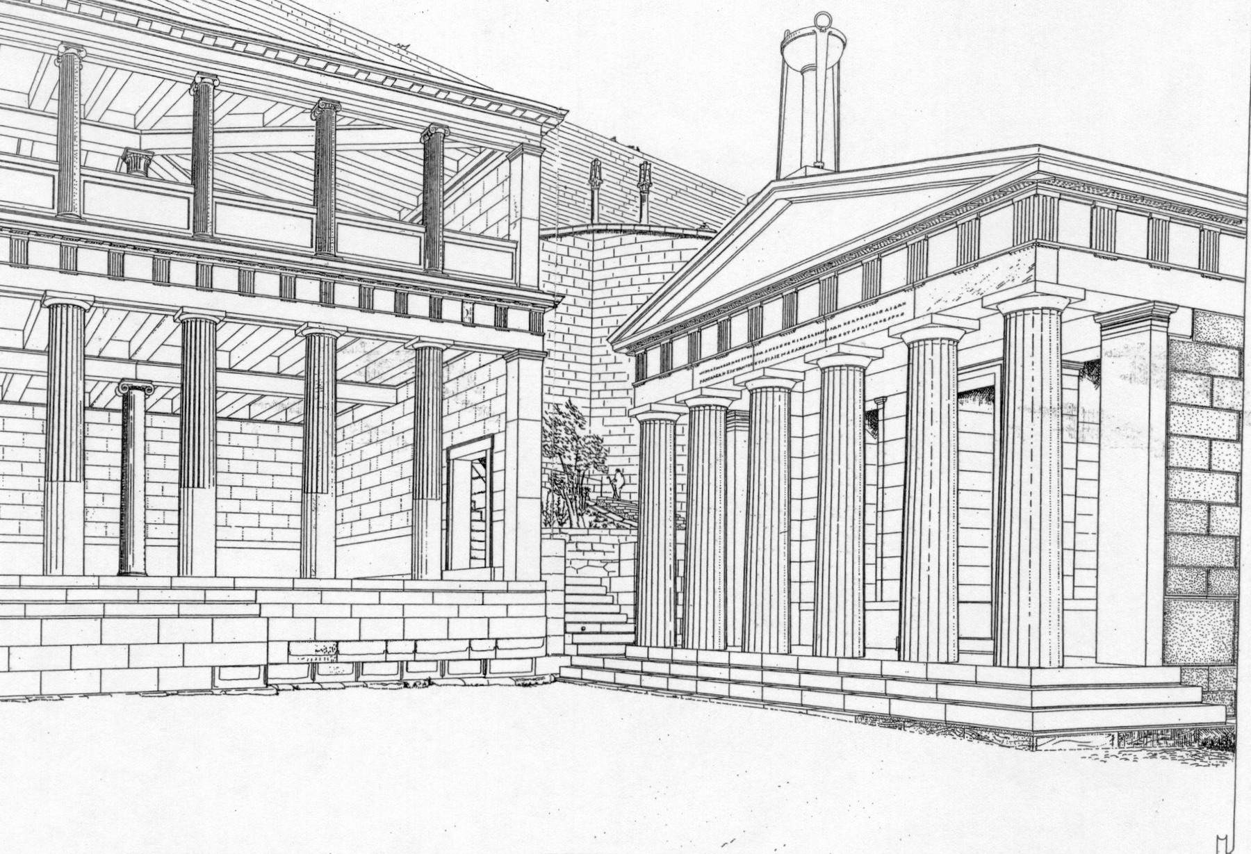 Το μνημείο έχει κατασκευαστεί από διαφορετικά υλικά: εκτός από τον κροκαλοπαγή και τον ακροπολίτη λίθο για τα θεμέλια, έχει χρησιμοποιηθεί ο πωρόλιθος και το πεντελικό μάρμαρο. Από τους πρώτους μελετητές του μνημείου είχε ταυτιστεί μεγάλος αριθμός διάσπαρτων μελών. Κατά τη δεκαετία του 1980 πραγματοποιήθηκε η μεταφορά εντός του μνημείου ενός τυμπάνου κίονα από το Ιερό του Διονύσου και ενός κιονόκρανου από την Αρχαία Αγορά. Έως το 2008 συγκεντρώθηκαν και μεταφέρθηκαν ακόμη 18 ταυτισμένα μέλη στο μνημείο, που είχαν παραμείνει σε διάφορα σημεία στον αρχαιολογικό χώρο της Ακρόπολης και των κλιτύων της (σε αποθήκη, στο εργοτάξιο του Παρθενώνα και σε λιθοσωρούς διασπάρτων). Για την σαφέστερη κατανόησή του, υλοποιήθηκε η διδακτική τοποθέτηση των μελών στον ανατολικό, νότιο και δυτικό τοίχο του μνημείου, ο οποίος συμπληρώθηκε με χυτό υλικό, ανάλογα με την αρχική τους θέση στο μνημείο. Τα δύο τμήματα του τυμπάνου, αν και δεν προέρχονται από την ίδια όψη, έχουν τοποθετηθεί στη πρόσοψη του μνημείου που ανοίγει προς τα δυτικά, ενώ προτάθηκε και μια συναρμογή θριγκού (γείσο με τους δύο λίθους τριγλύφων και μετωπών). Τέλος, κατασκευάστηκε και τοποθετήθηκε ενημερωτική δίγλωσση πινακίδα για το κοινό.