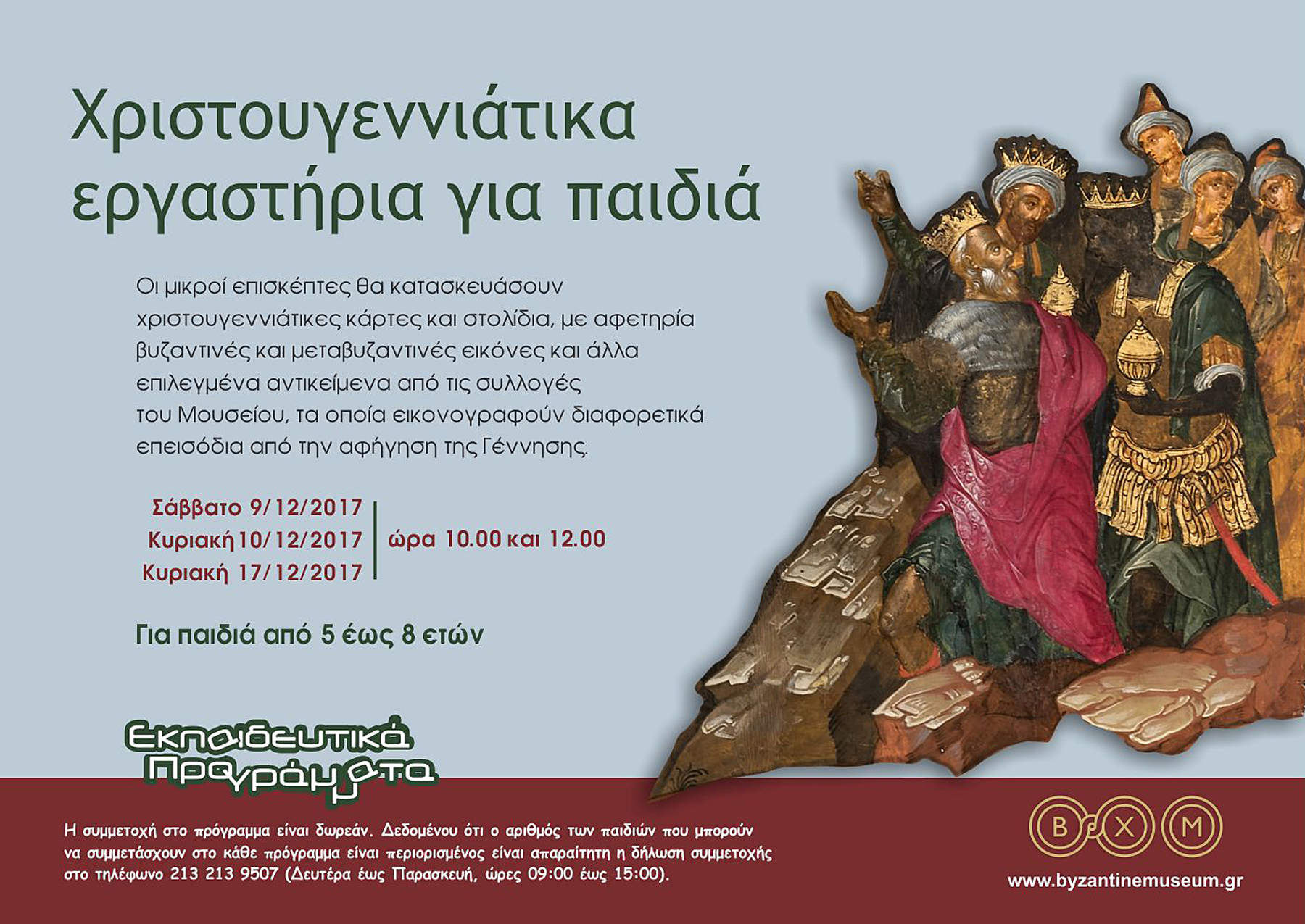 Οι μικροί επισκέπτες θα κατασκευάσουν χριστουγεννιάτικες κάρτες και στολίδια, με αφετηρία βυζαντινές και μεταβυζαντινές εικόνες και άλλα επιλεγμένα αντικείμενα από τις Συλλογές του Μουσείου, τα οποία εικονογραφούν διαφορετικά επεισόδια από την αφήγηση της Γέννησης.