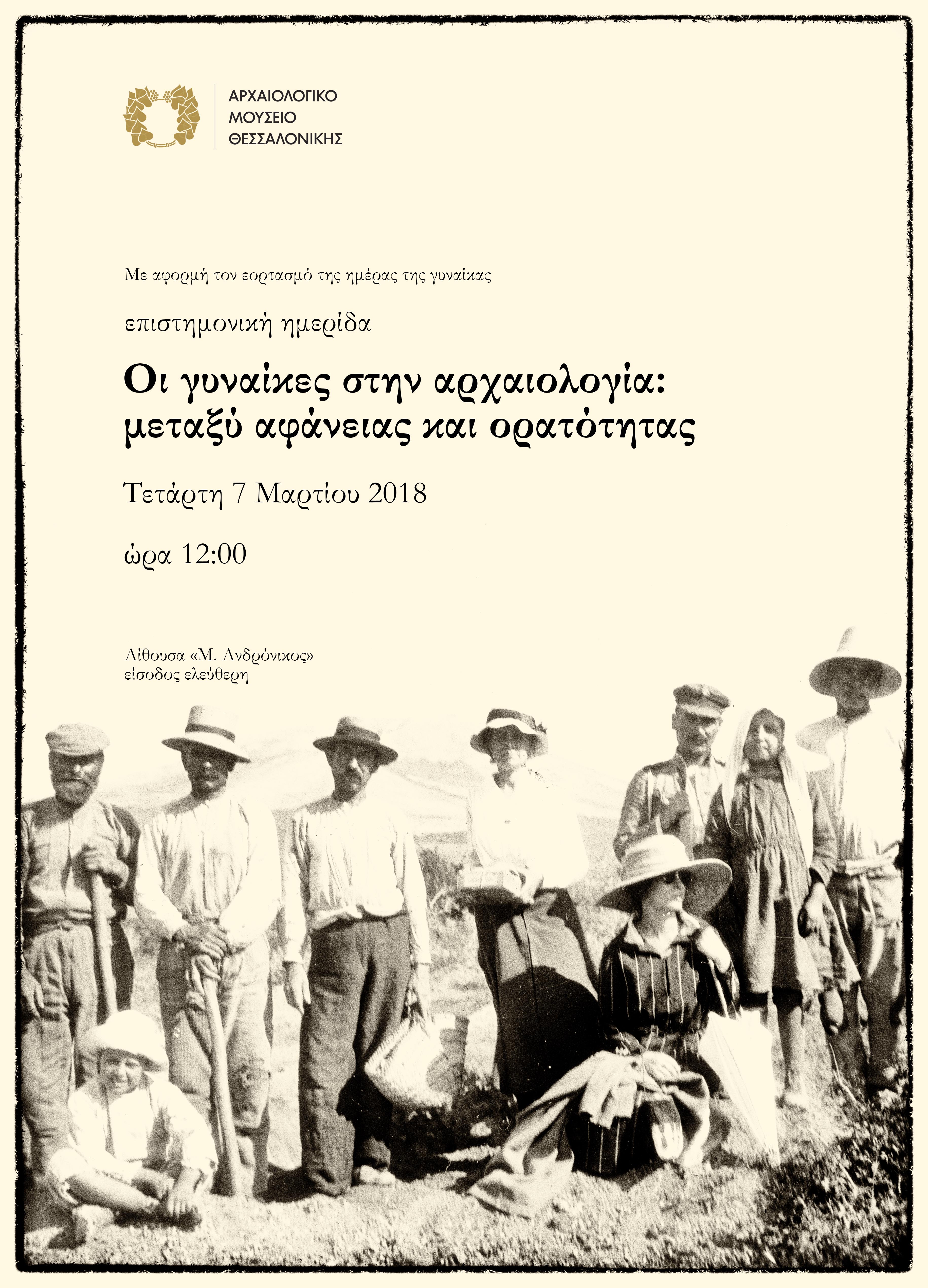 Το Αρχαιολογικό Μουσείο Θεσσαλονίκης σε συνεργασία με τον Σύνδεσμο Φίλων του ΑΜΘ διοργανώνει την Τετάρτη 7 Μαρτίου 2018 ημερίδα με τίτλο: «Οι γυναίκες στην αρχαιολογία: μεταξύ αφάνειας και ορατότητας».