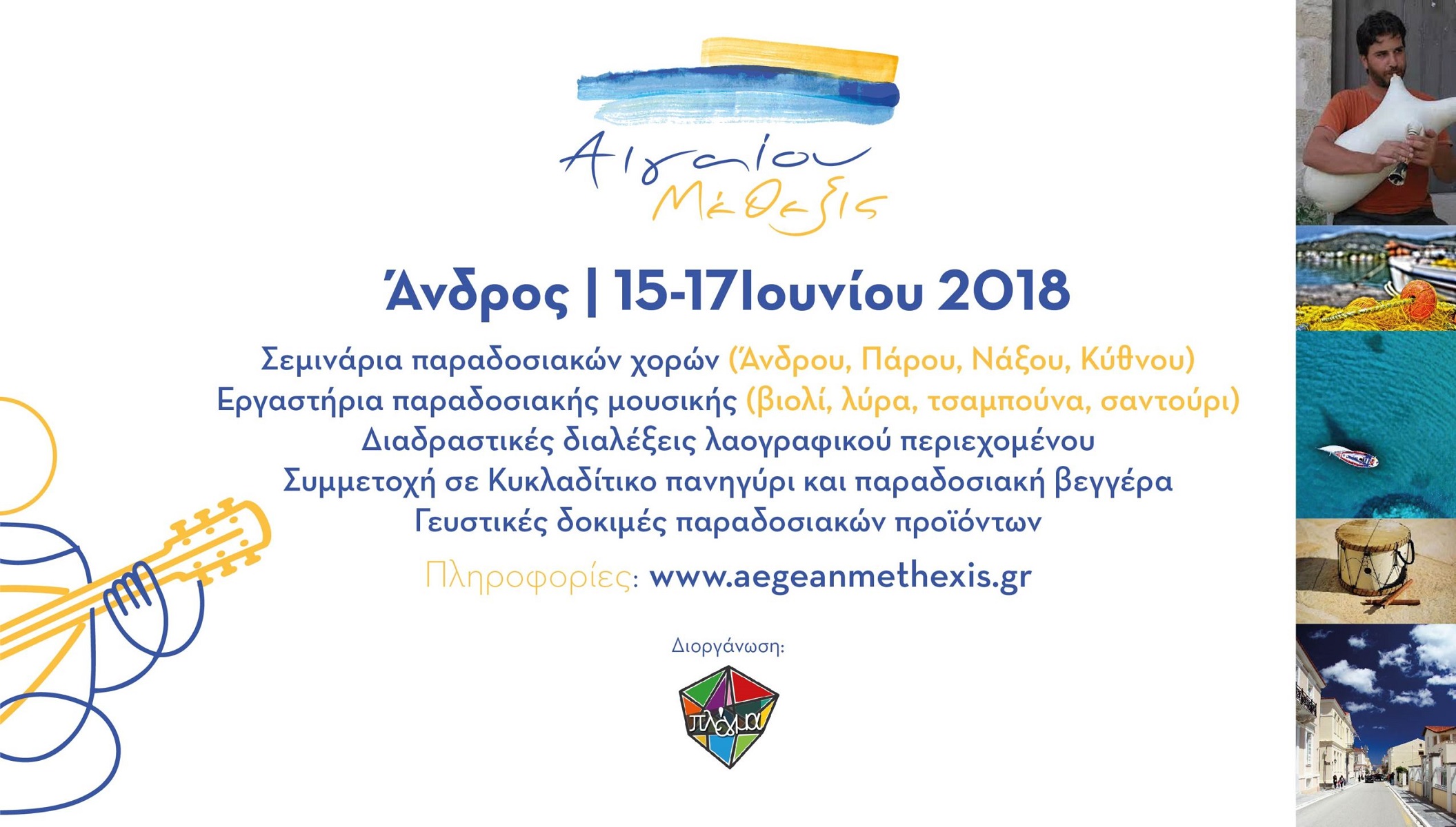 Πρόκειται για ένα τριήμερο βιωματικό σεμινάριο με στόχο τη γνωριμία των συμμετεχόντων με το λαϊκό πολιτισμό και τη μουσικοχορευτική παράδοση του Αιγαίου και τη μέθεξη στα αυθεντικά πανηγύρια.